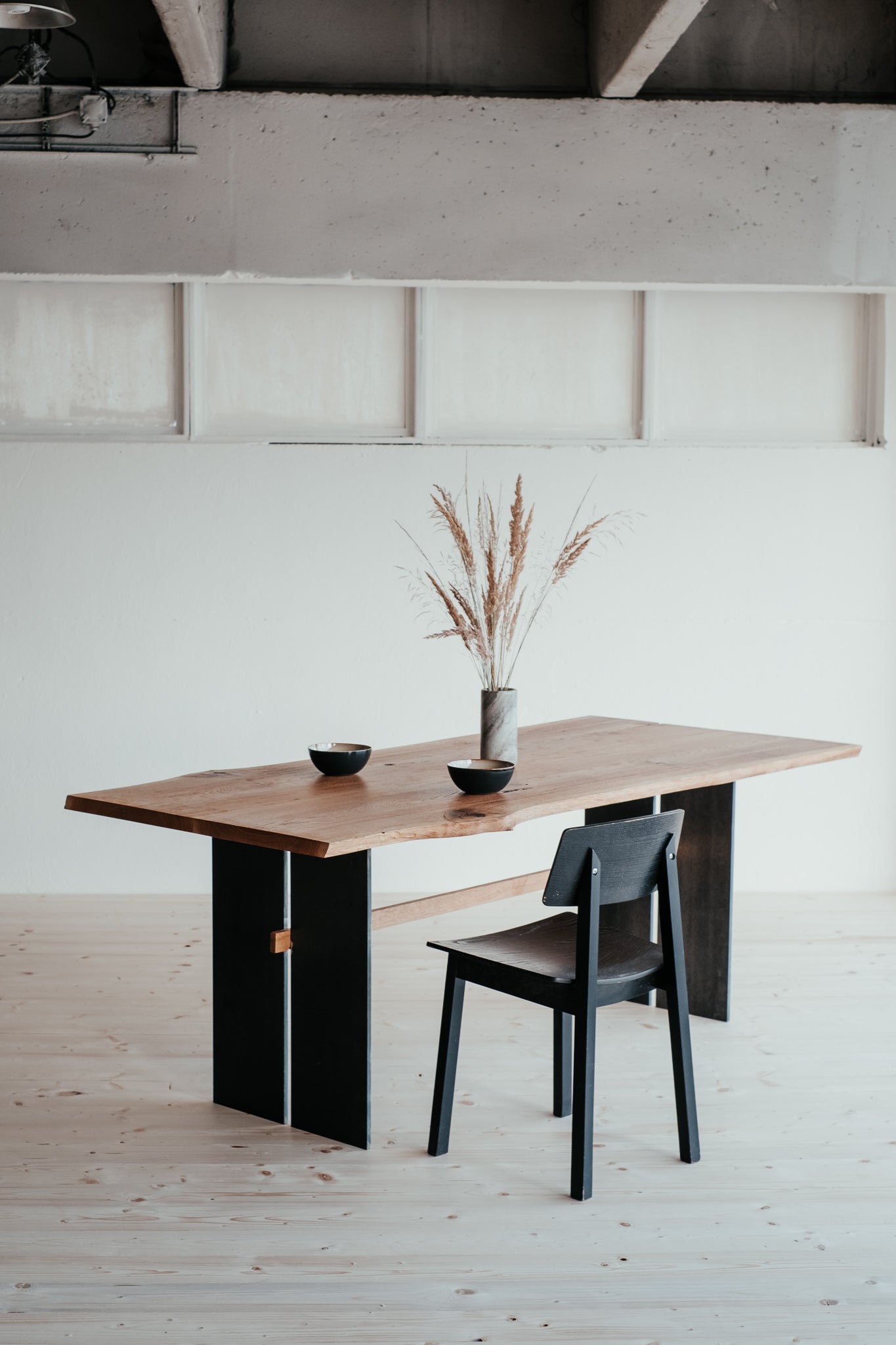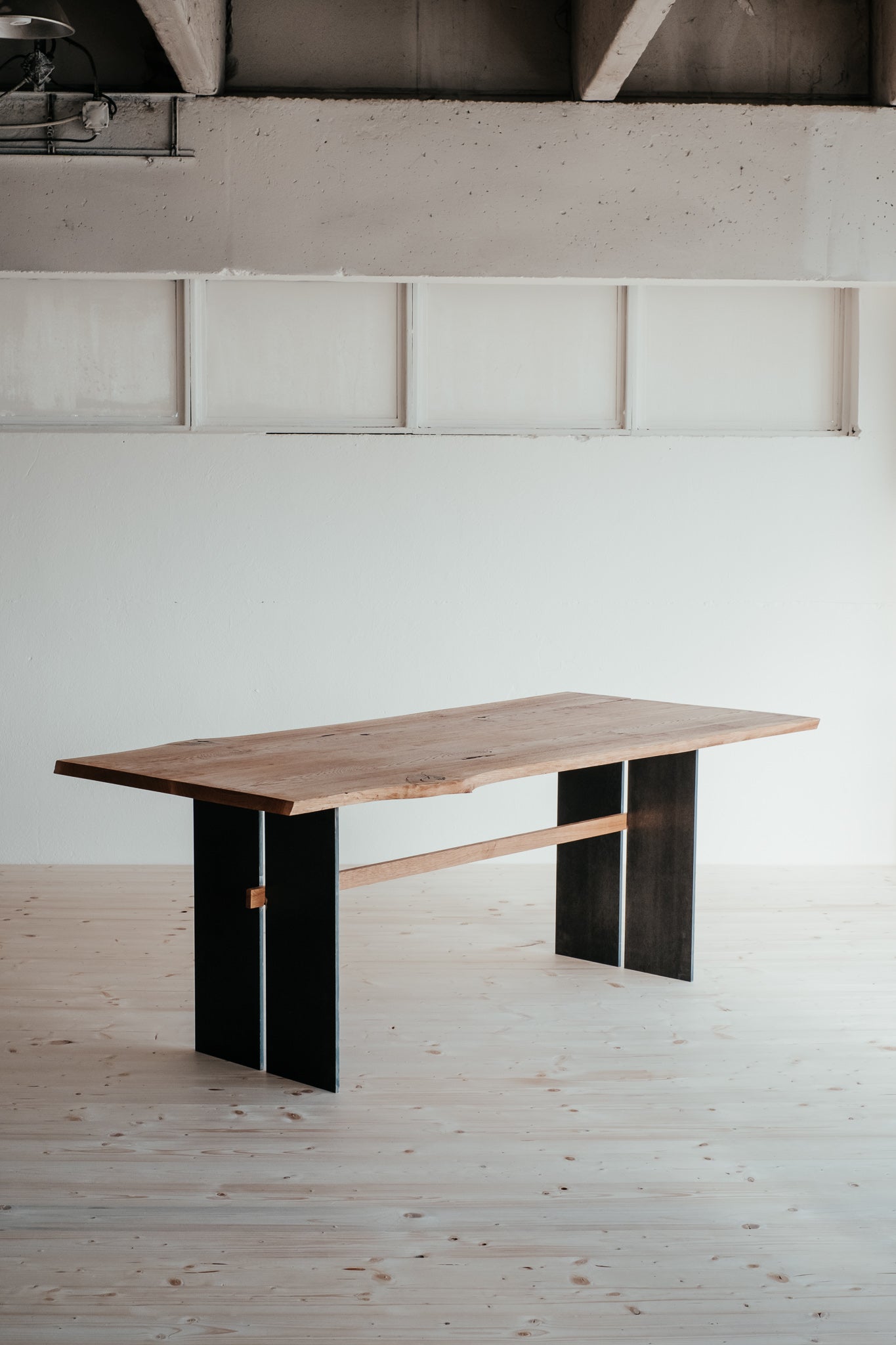 Polomonolit s plným právom nárokovať si titul kráľ stolov. Dve masívne dosky vyrobené z pozdĺžneho rezu dubom sme spojili do harmonického, prírodného celku. Oceľové kostičky v spojoch a prasklinách mu dodávajú jedinečný charakter. Rovnako, ako silné železné nohy eleganciu.