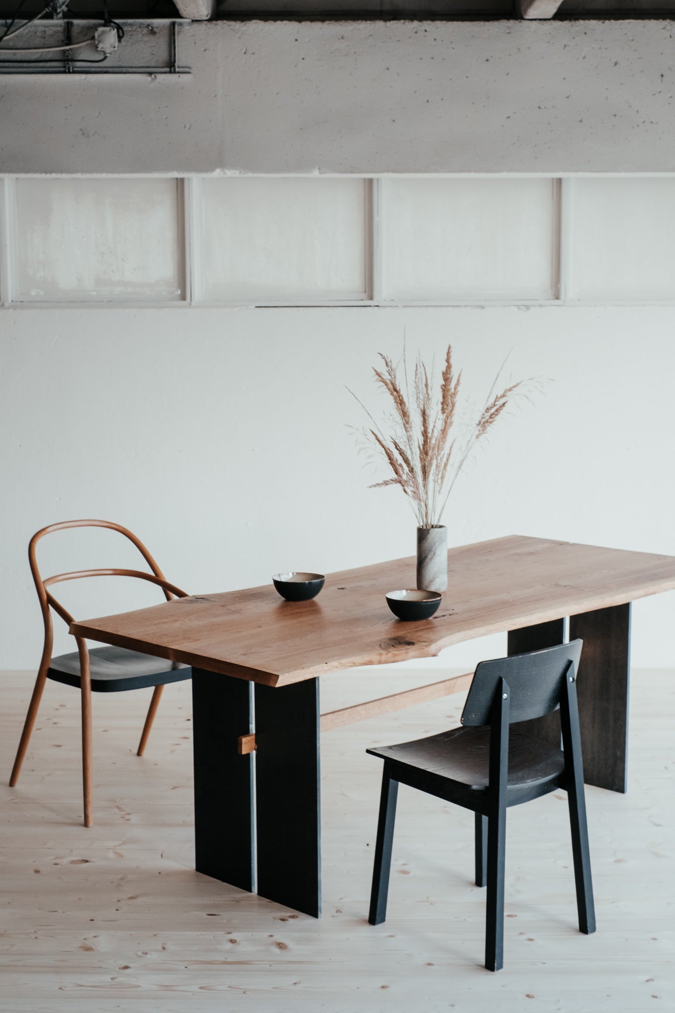 Spojenie, akému na svete niet páru. Tento polomonolitický očarujúci stôl je zložený z dvoch nádherných fošní z masívneho dubového dreva, ktoré si zachovalo všetku svoju surovú krásu a nepravidelné línie. Priznané praskliny zastabilizované oceľovými “kostičkami” mu dodávajú naturalistický charakter. Pevne stojí na dvoch elegantných nohách z pevného železa.