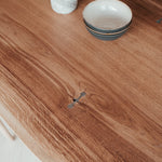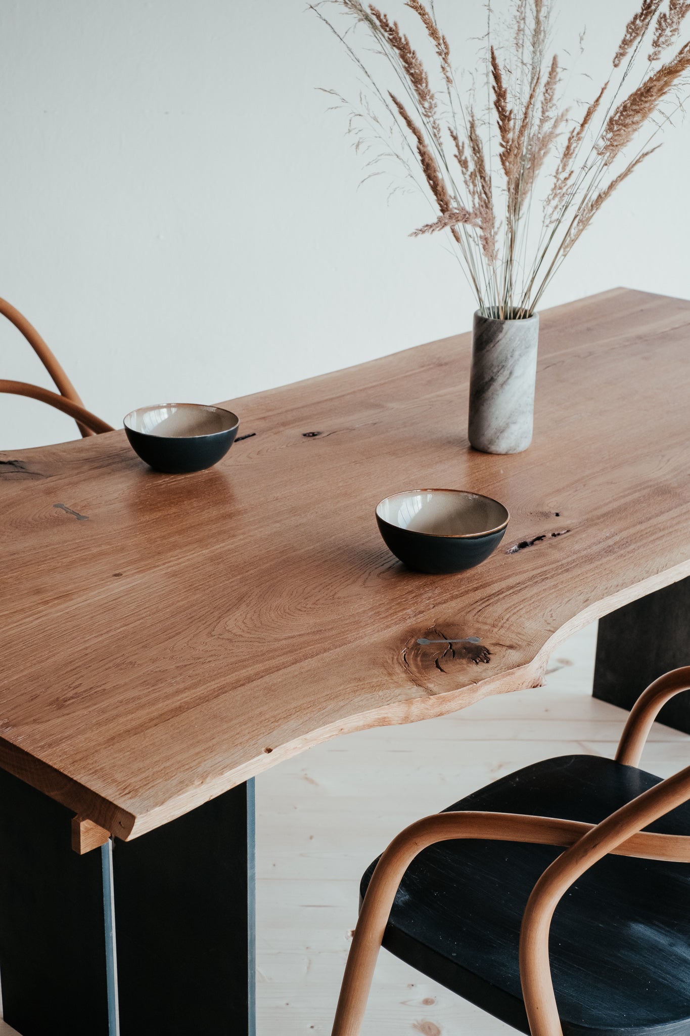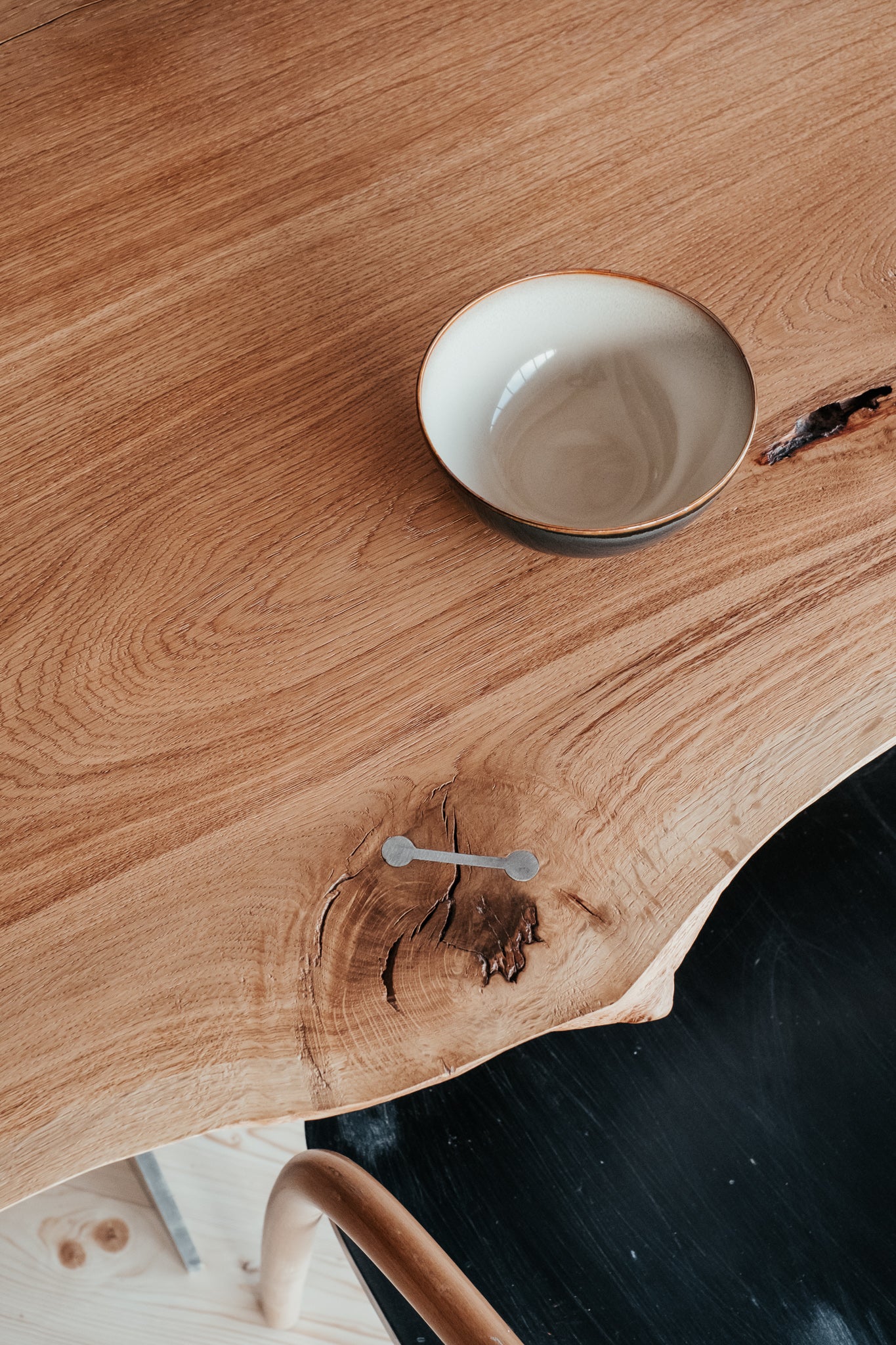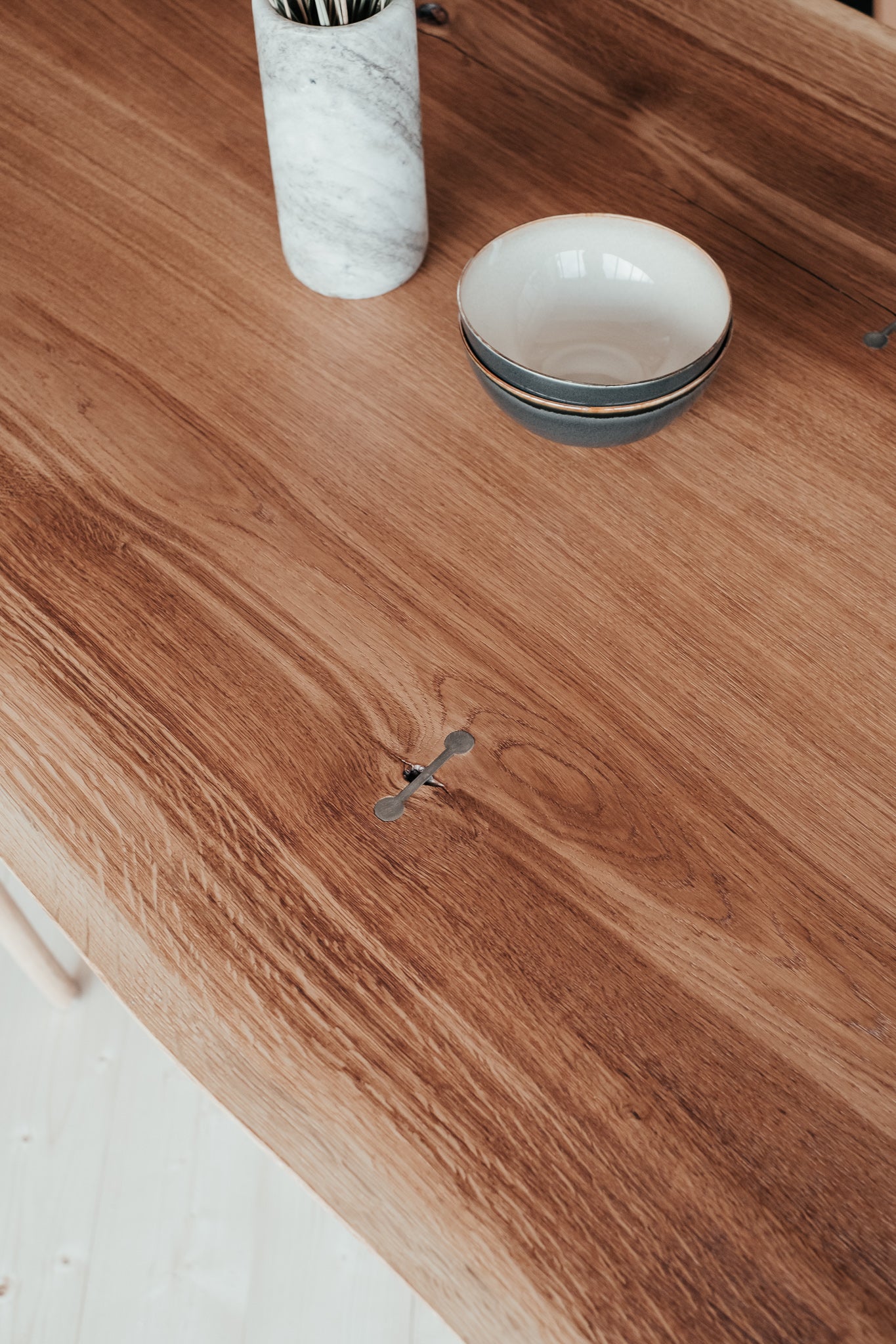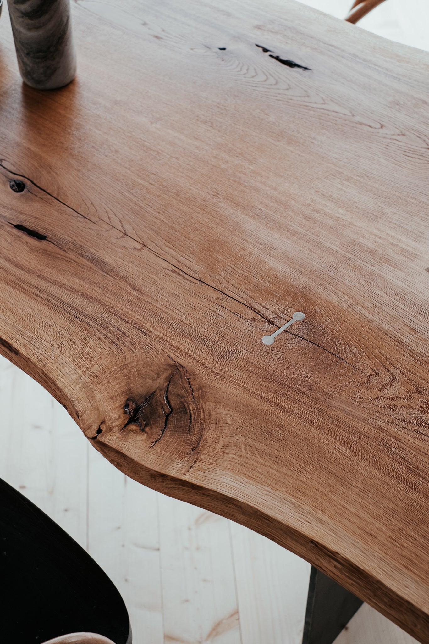 Základom tohto stolu je masívne dubové drevo najvyššej kvality. Praskliny sme dôkladne ošetrili živicou a mechanickými prvkami. Aby sme zabezpečili maximálnu kvalitu a životnosť, dbali sme na každý detail, ako je starostlivý výber dreva, jeho vlhkosť aj ošetrenie. Vďaka tomu sme z krásneho stromu dokázali vytvoriť dokonalý stôl.