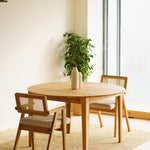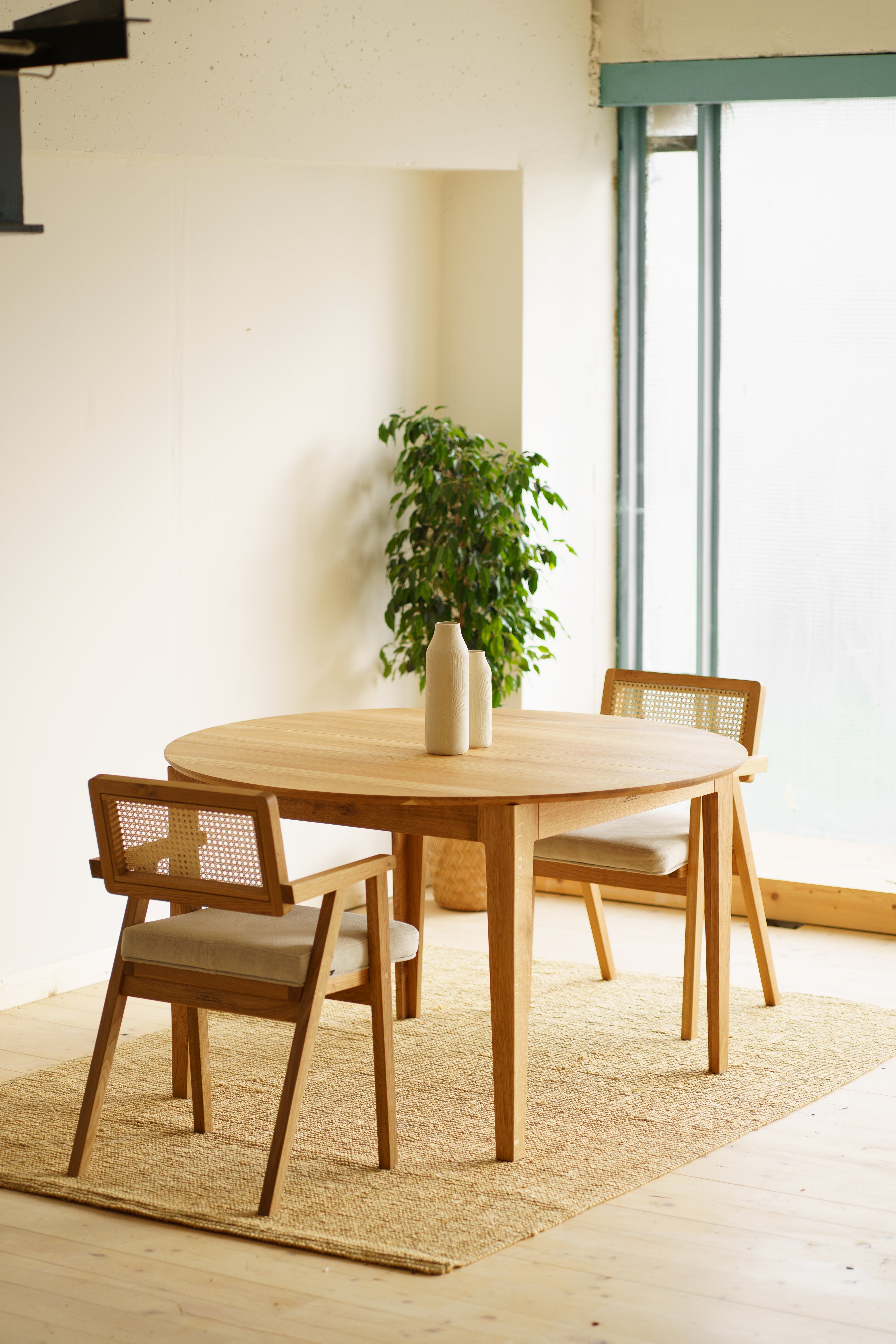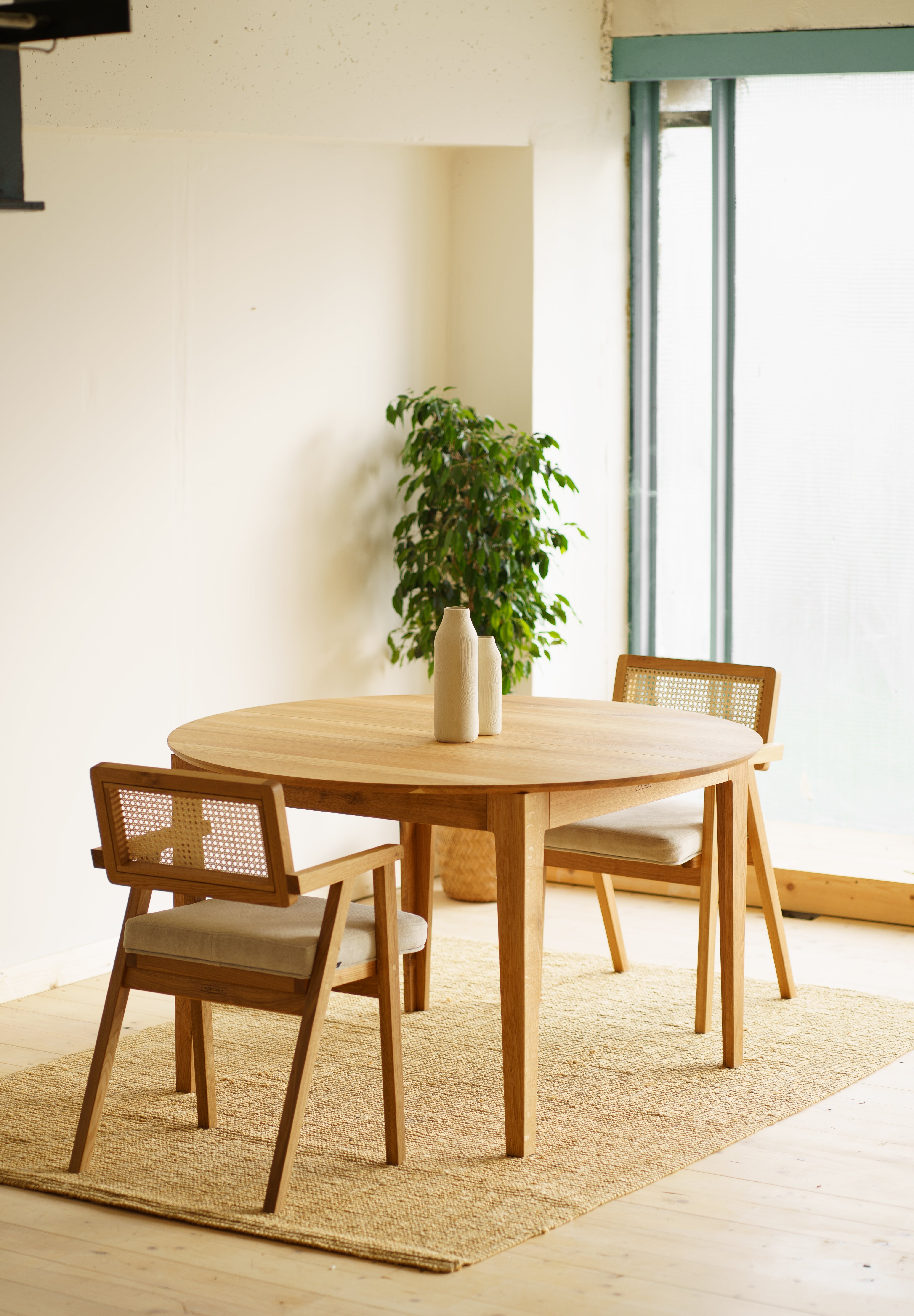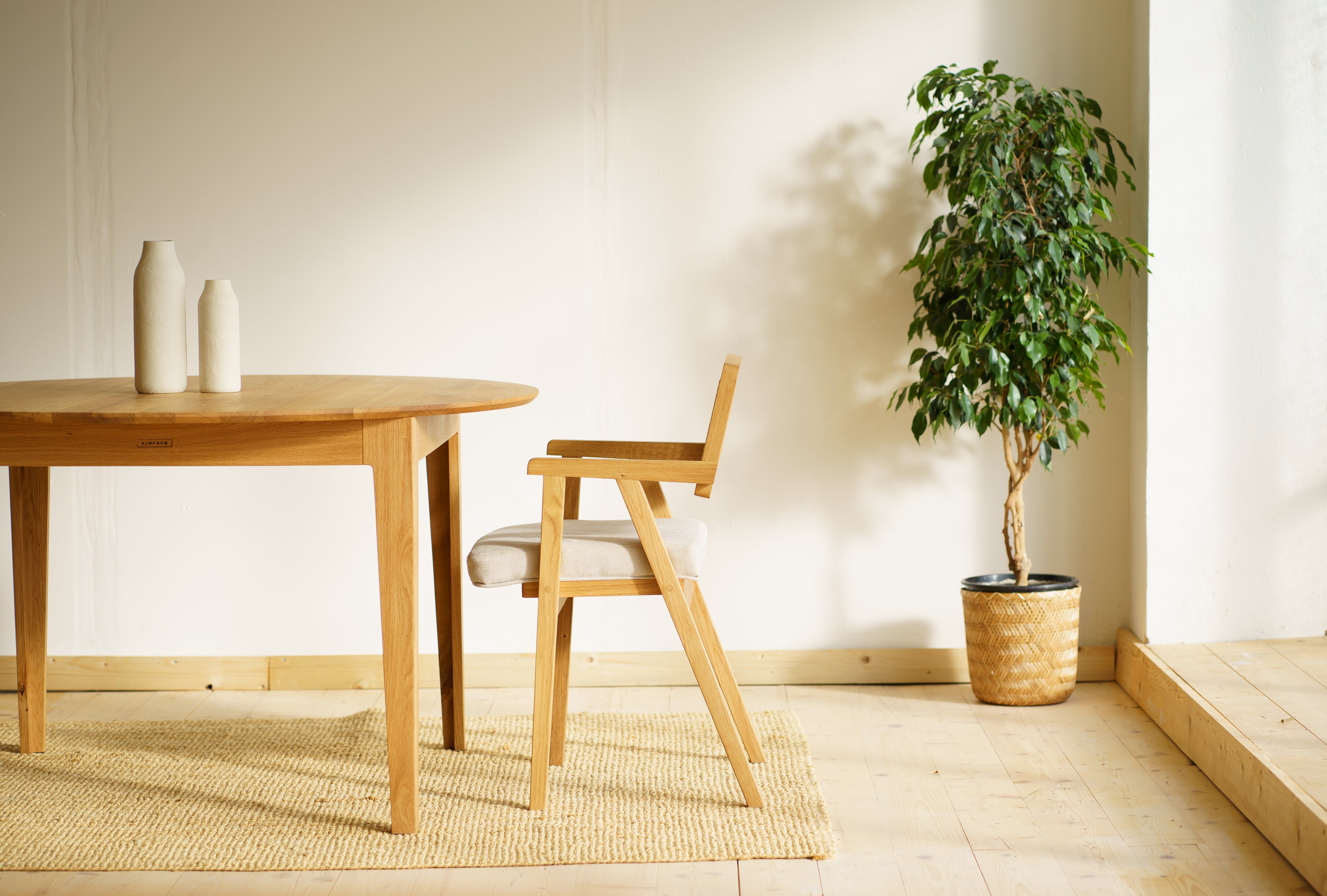 Colorless, natural wax oil emphasizes the aesthetic grain of the wood and easy maintenance. The round shape of the tabletop brings purity and aesthetics, thanks to which the beauty of this table stands out even more.