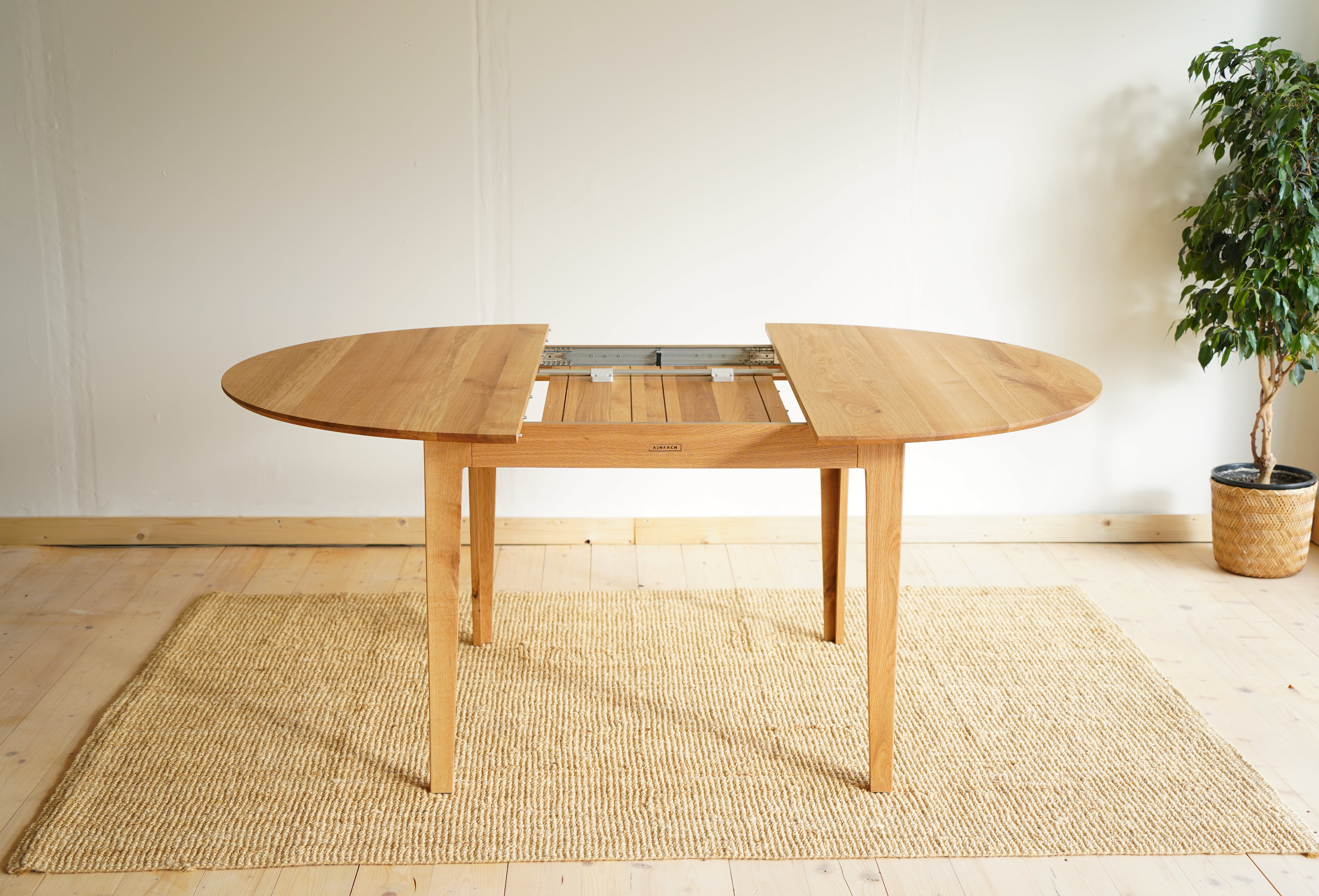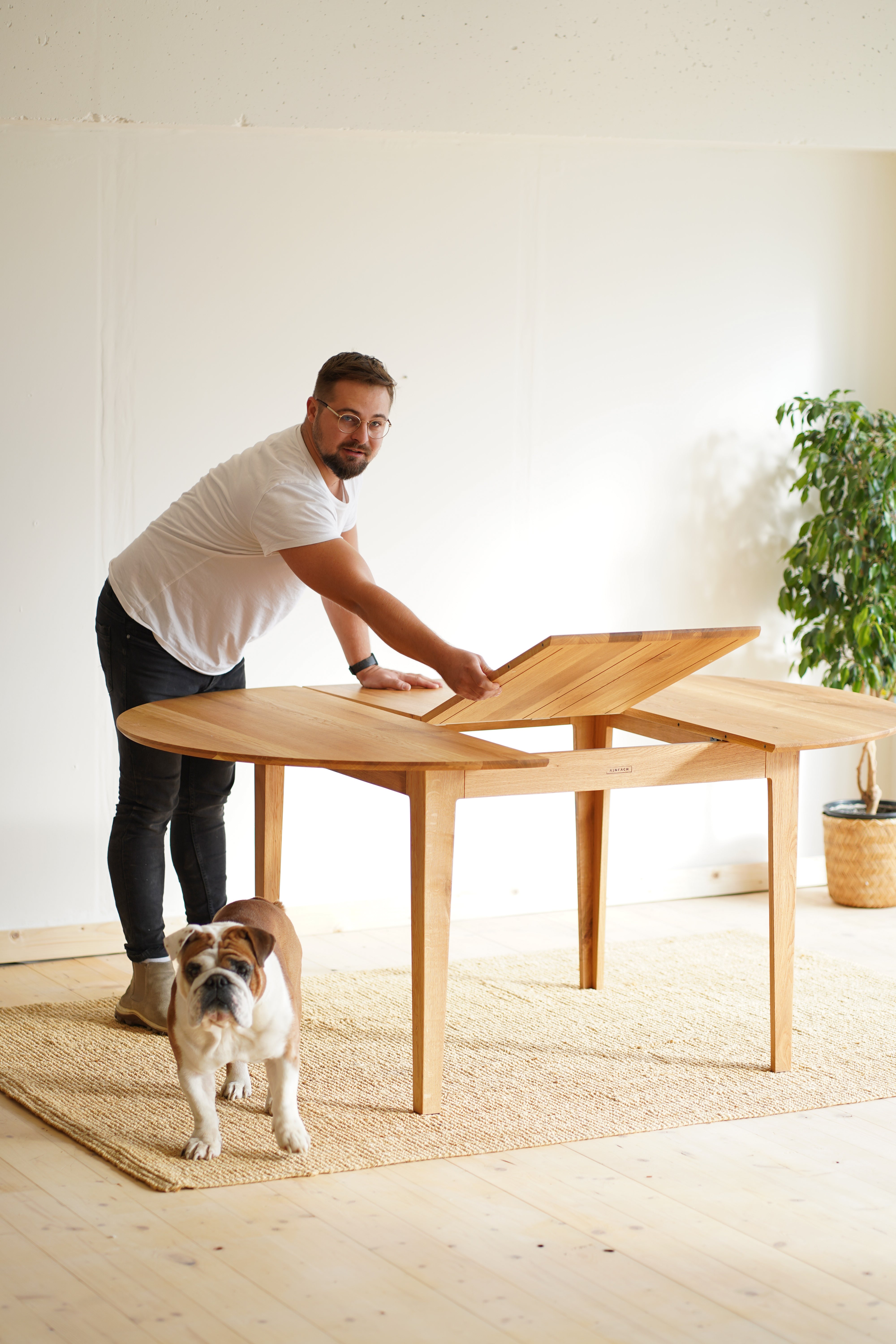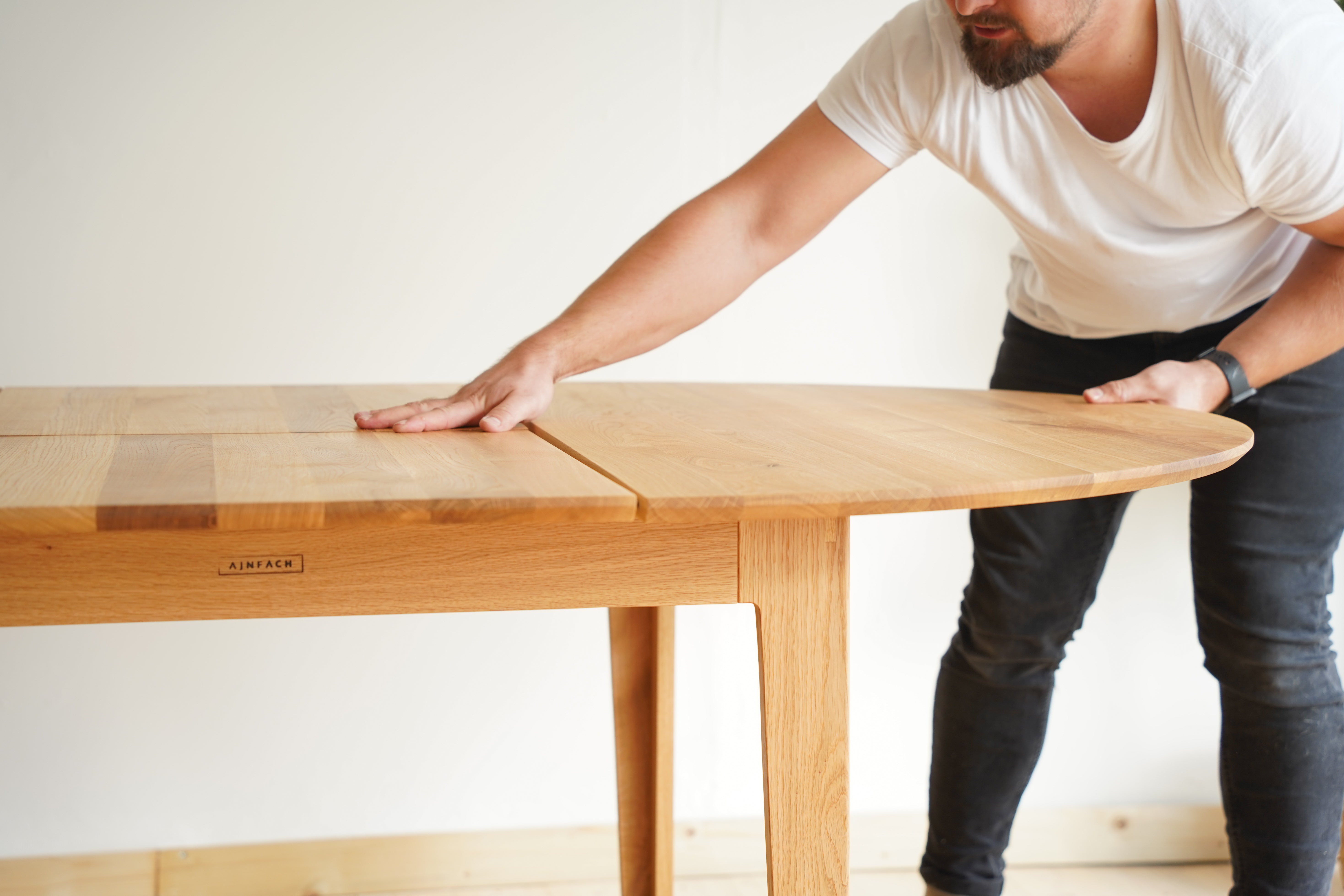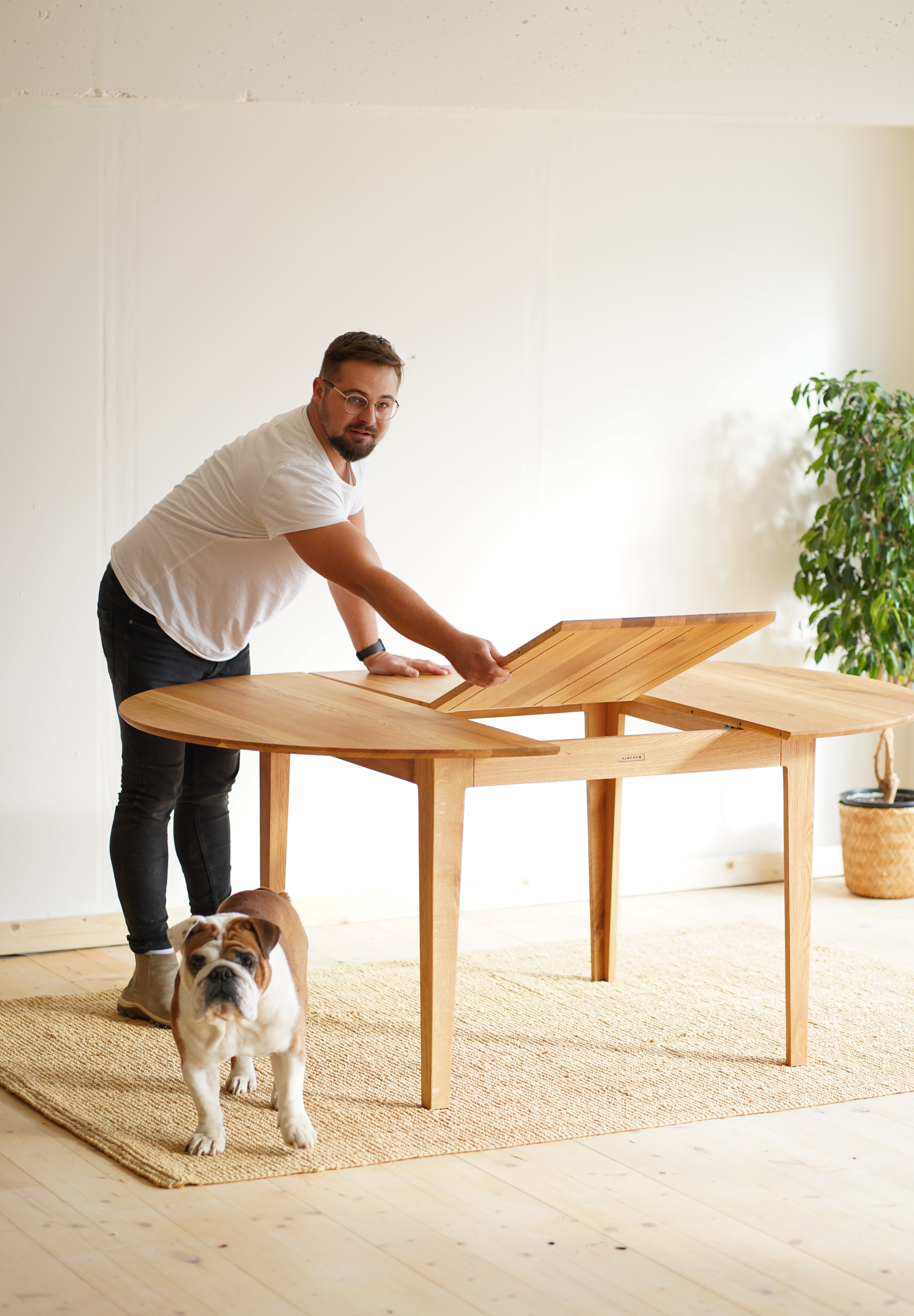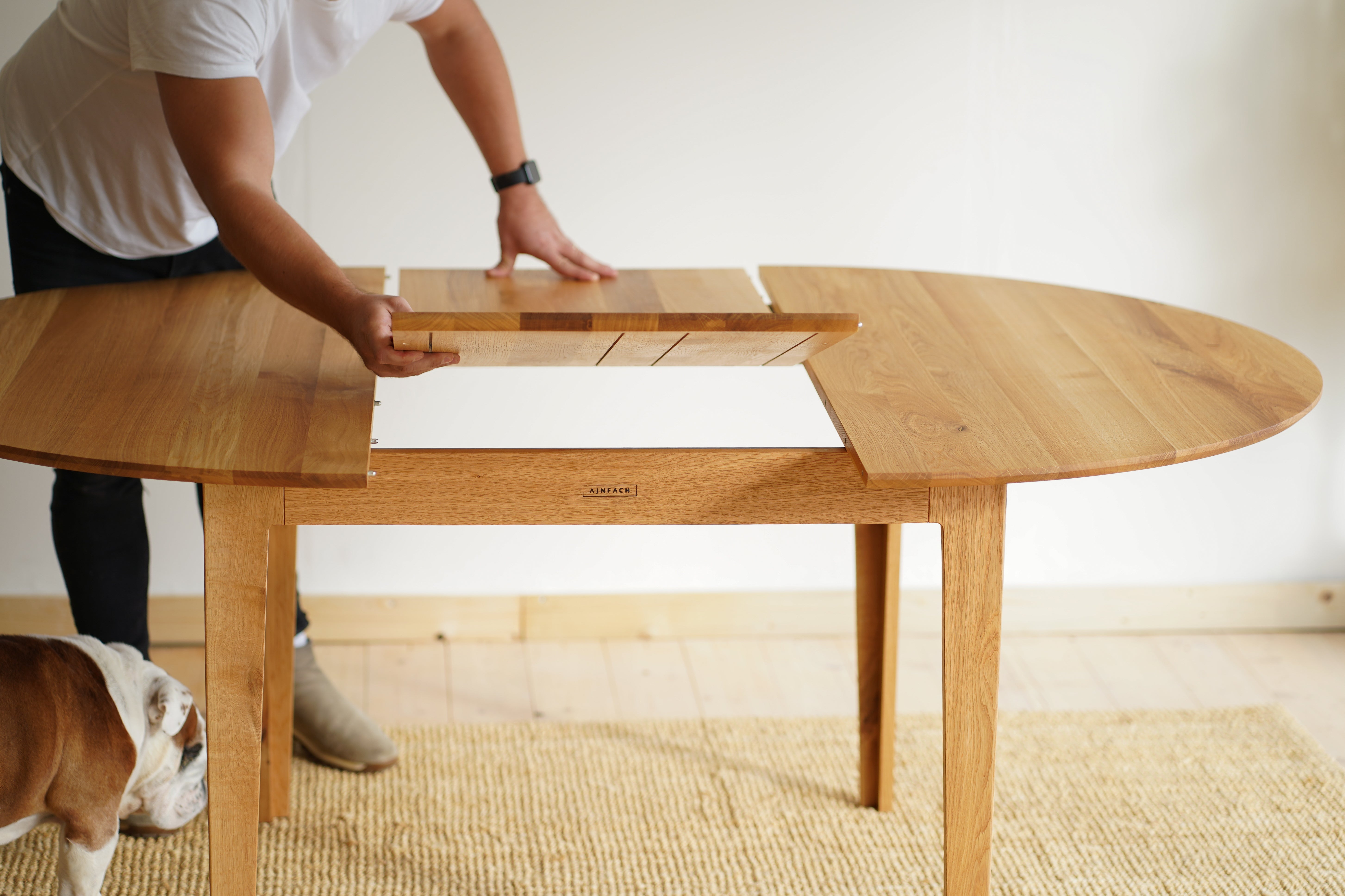 The handcrafted design is hidden behind a simple round table top made of solid oak wood, which is supported by elegant oak legs. But inside it already awaits an ingenious folding mechanism, with which you can easily enlarge the table.