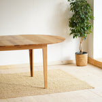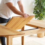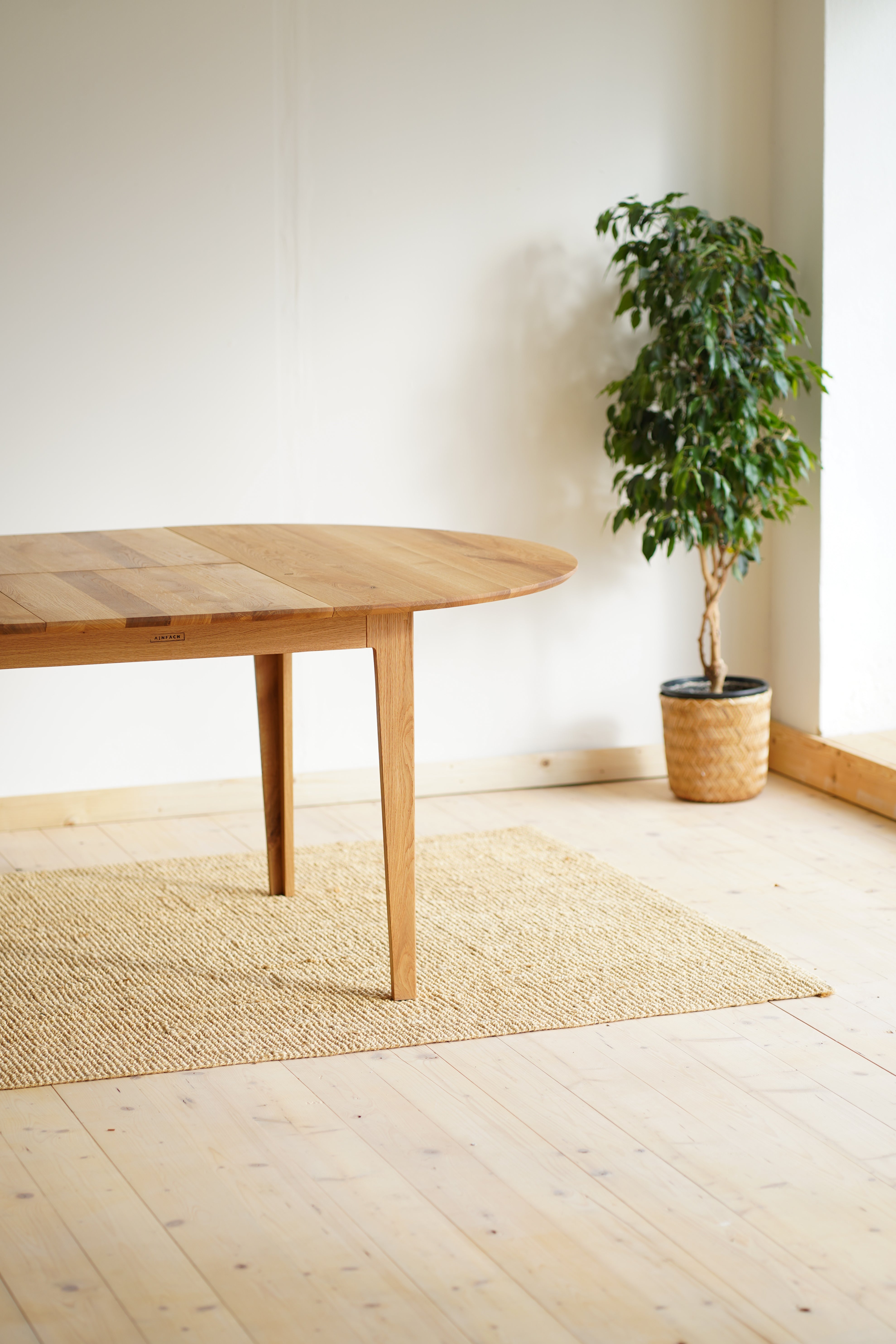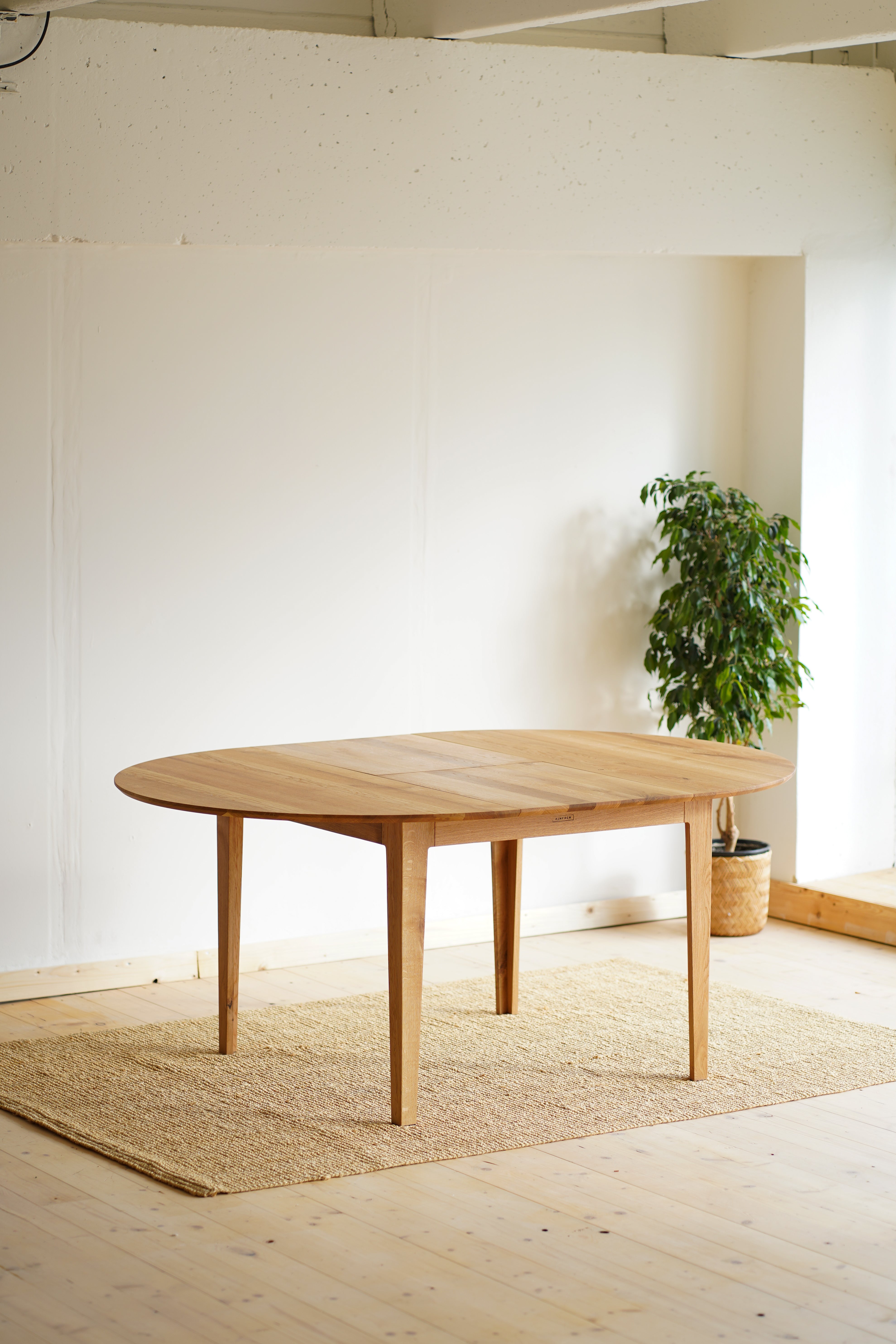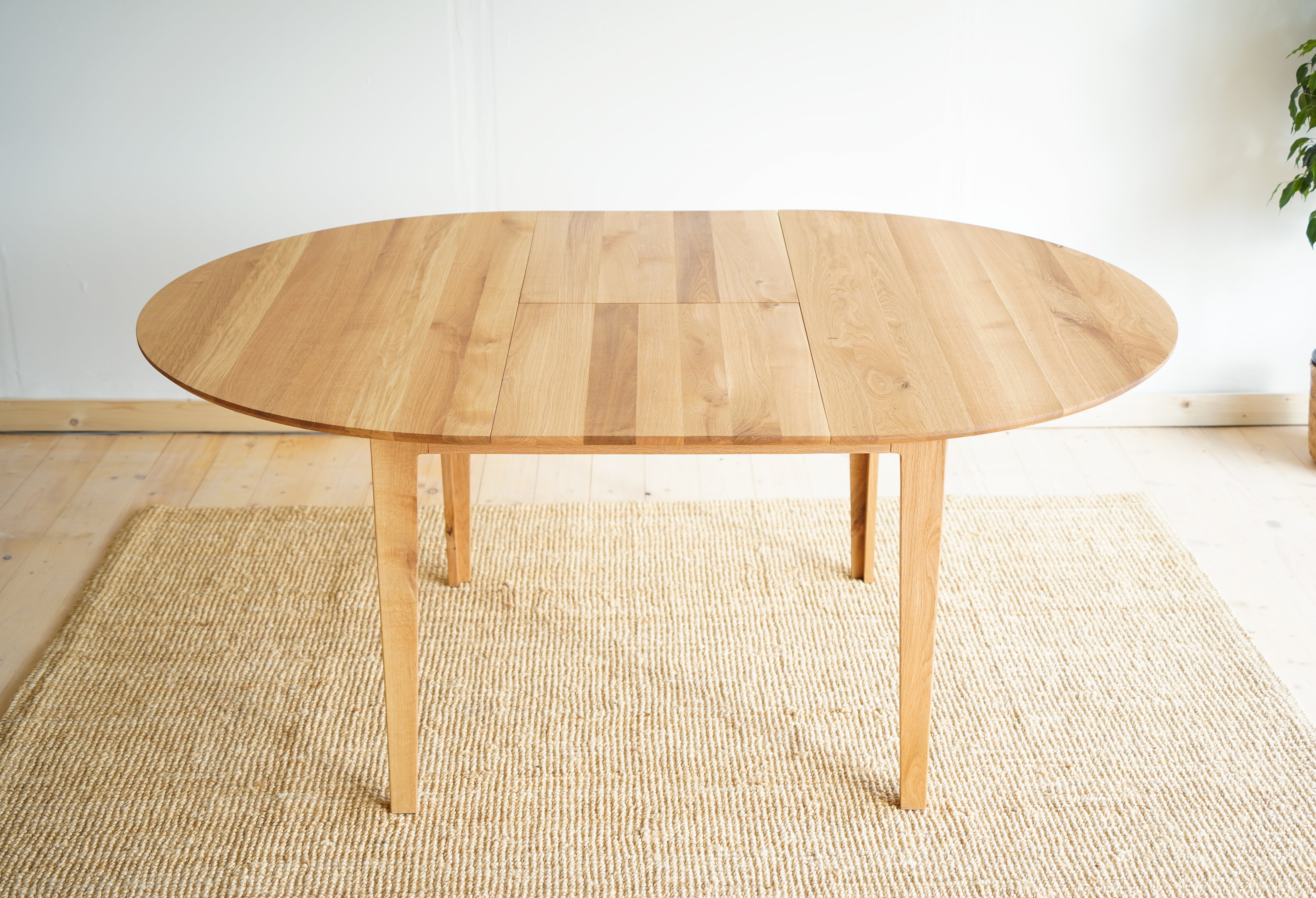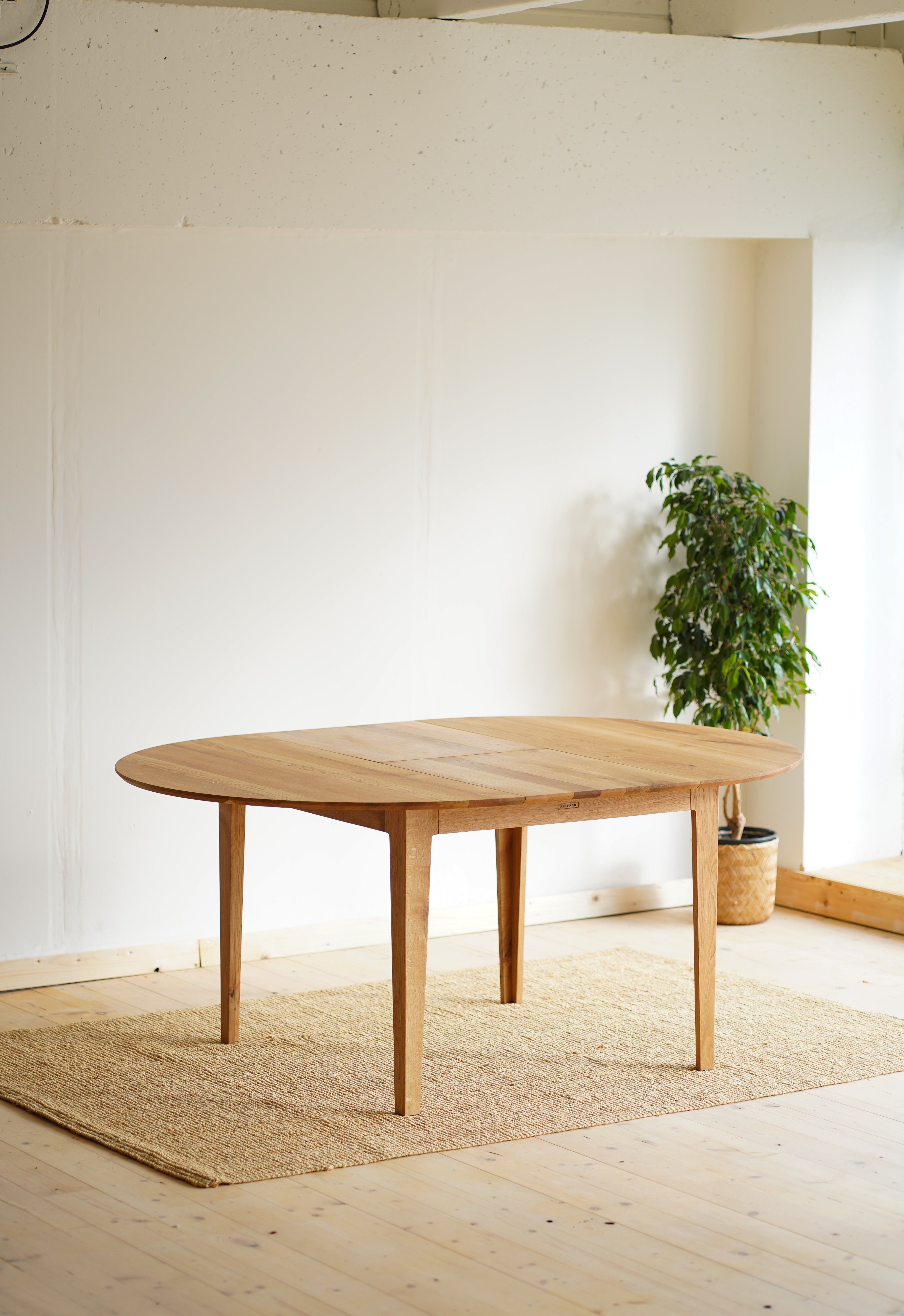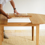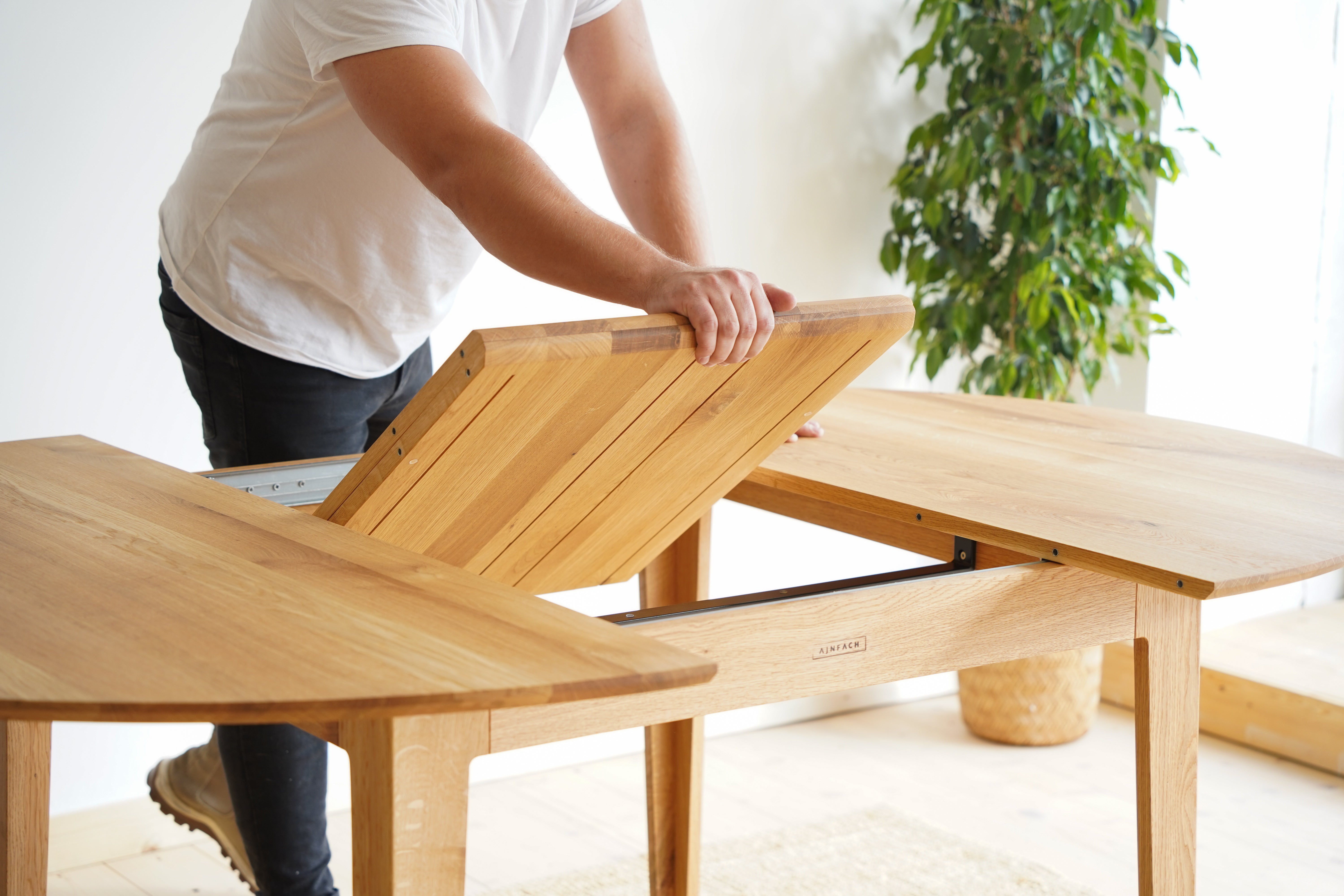 The handcrafted design is hidden behind a simple round table top made of solid oak wood, which is supported by elegant oak legs. But inside it already awaits an ingenious folding mechanism, with which you can easily enlarge the table.