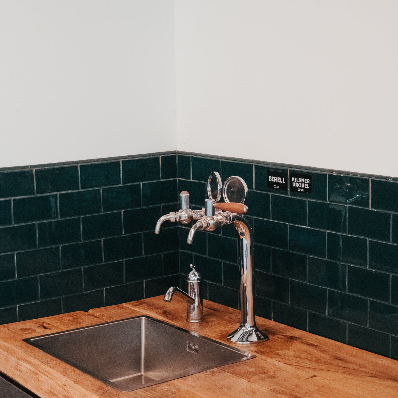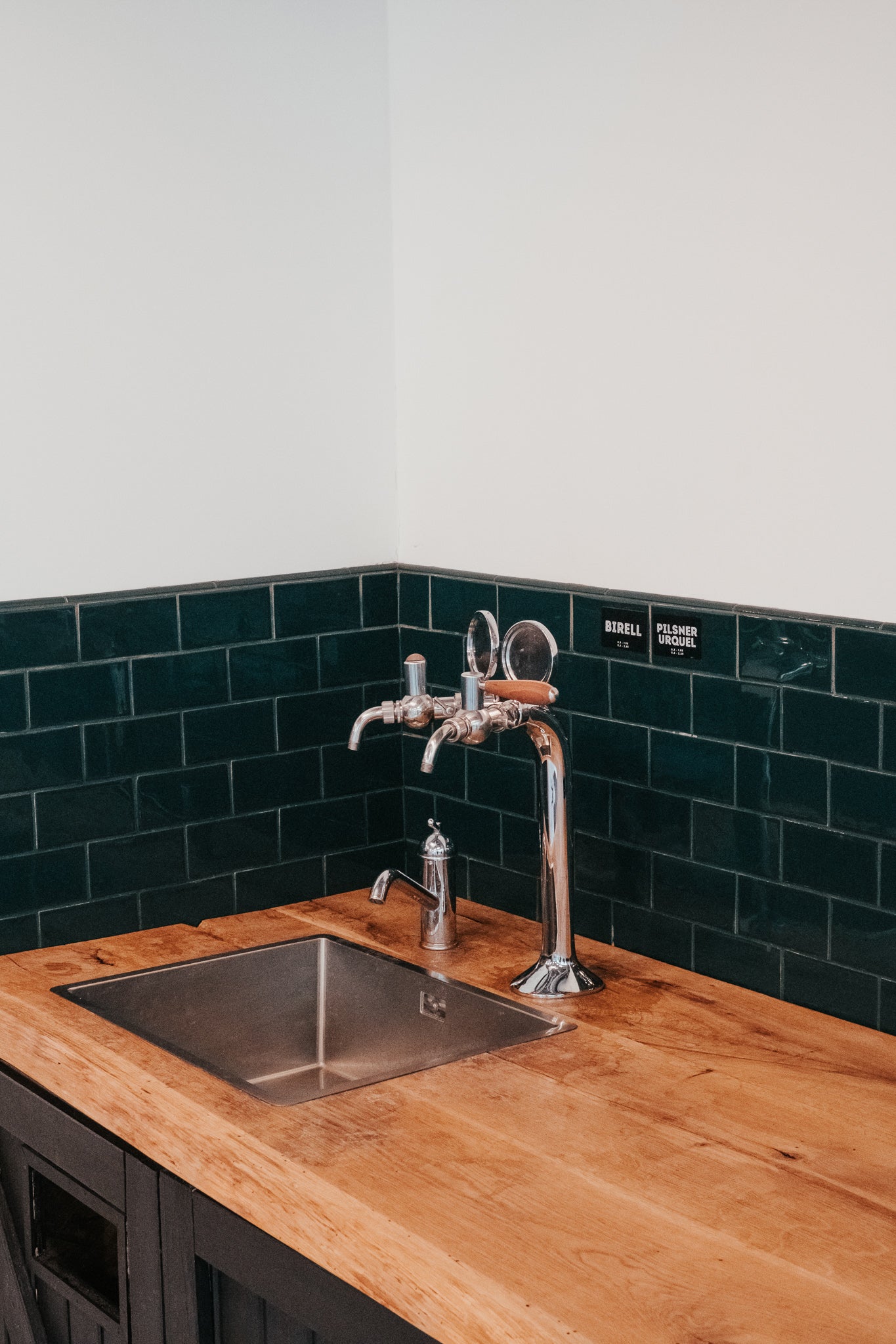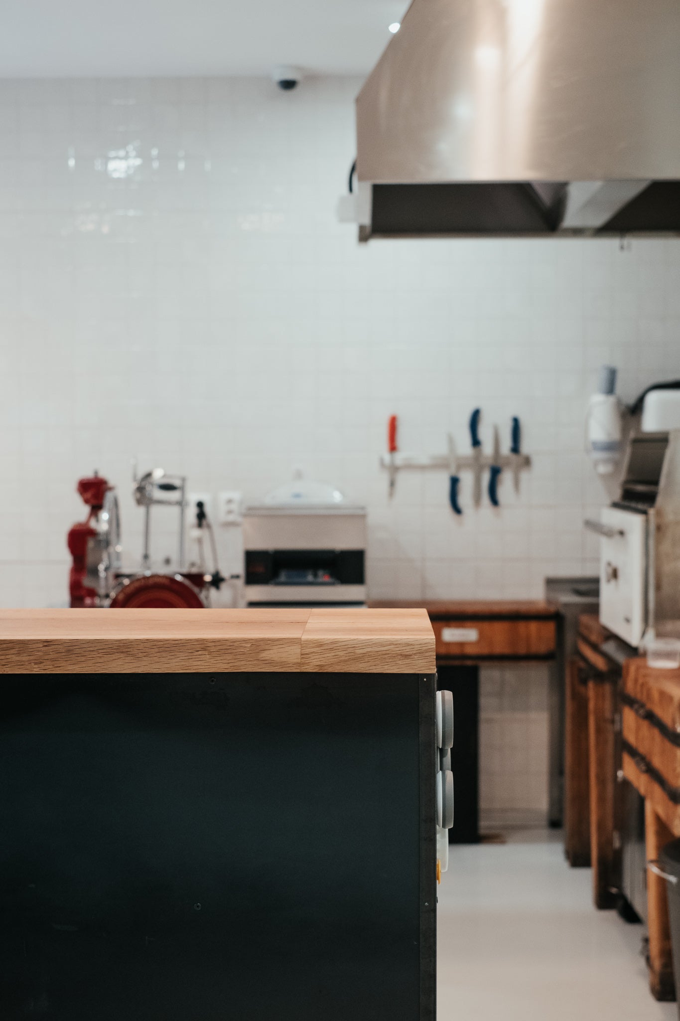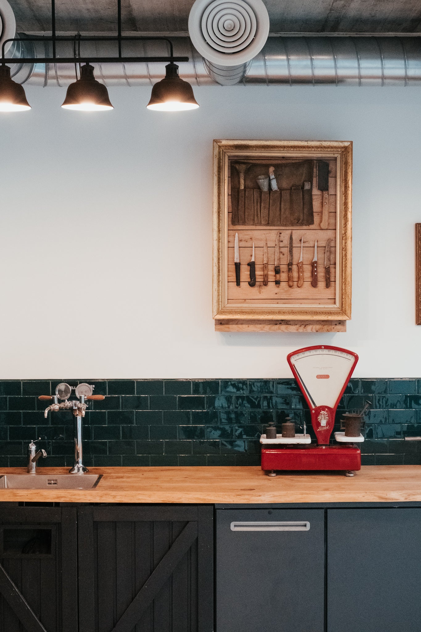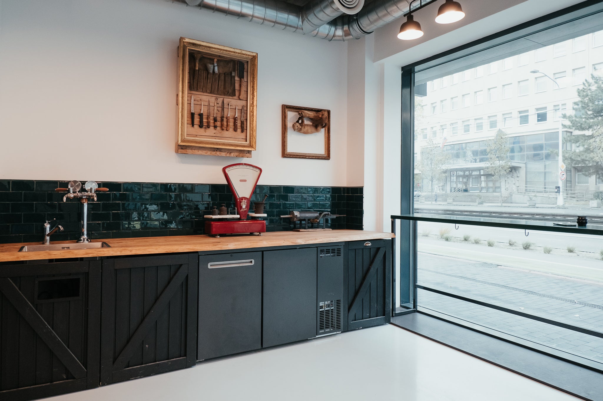 Umocniť raw feeling moderného poctivého mäsiarstva spojeného s jedálňou bolo zaujímavým projektom, do ktorého sme sa pustili s chuťou. Výsledkom boli masívne dubové dosky na stoloch, ktoré vynikali svojou surovou krásou. K tomu sme sa postarali aj o výrobu hlavného pultu a pultu s pípou, ktoré boli ladené do pomerne maskulínneho a priemyselného dizajnu prevádzky.