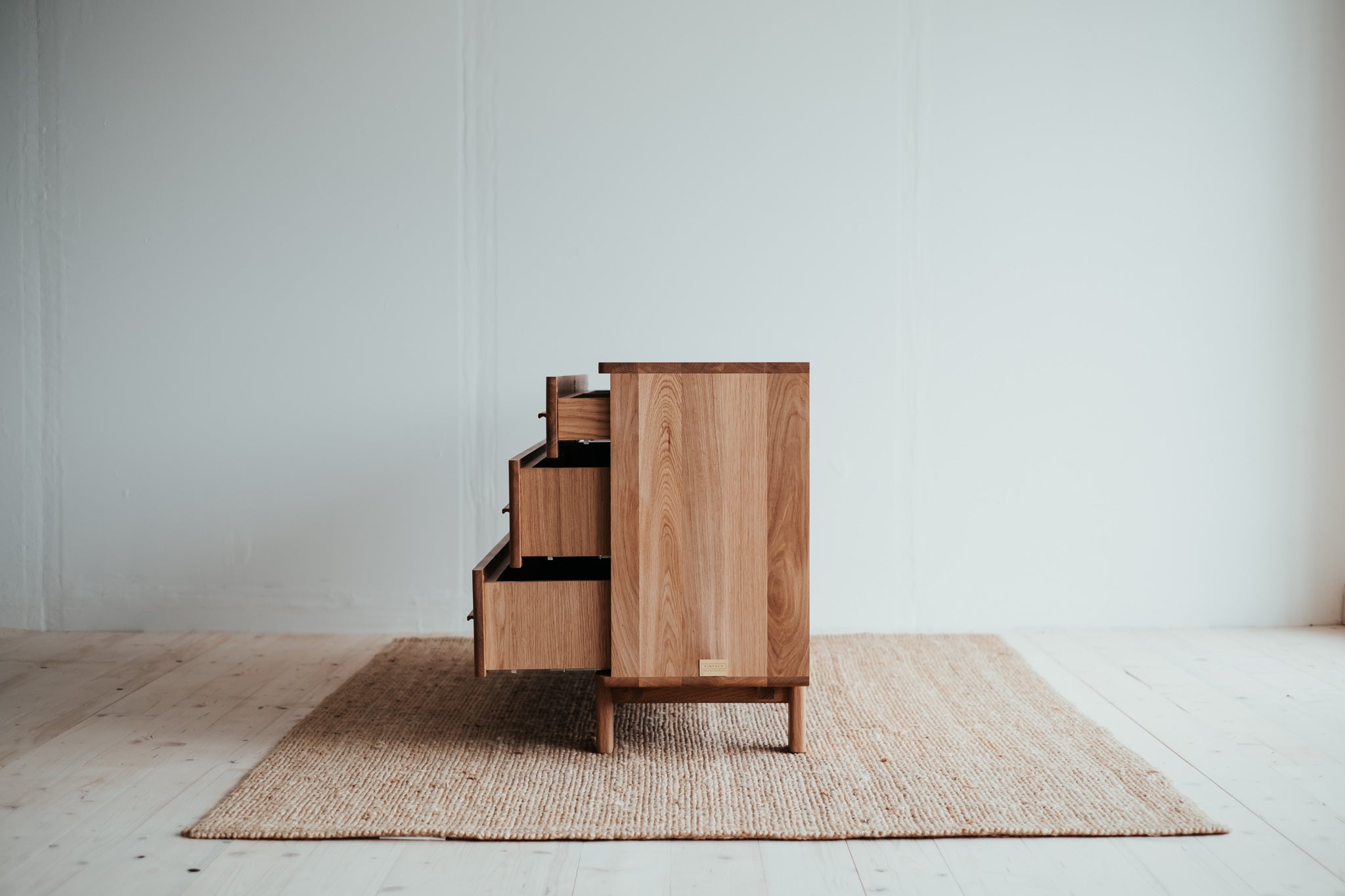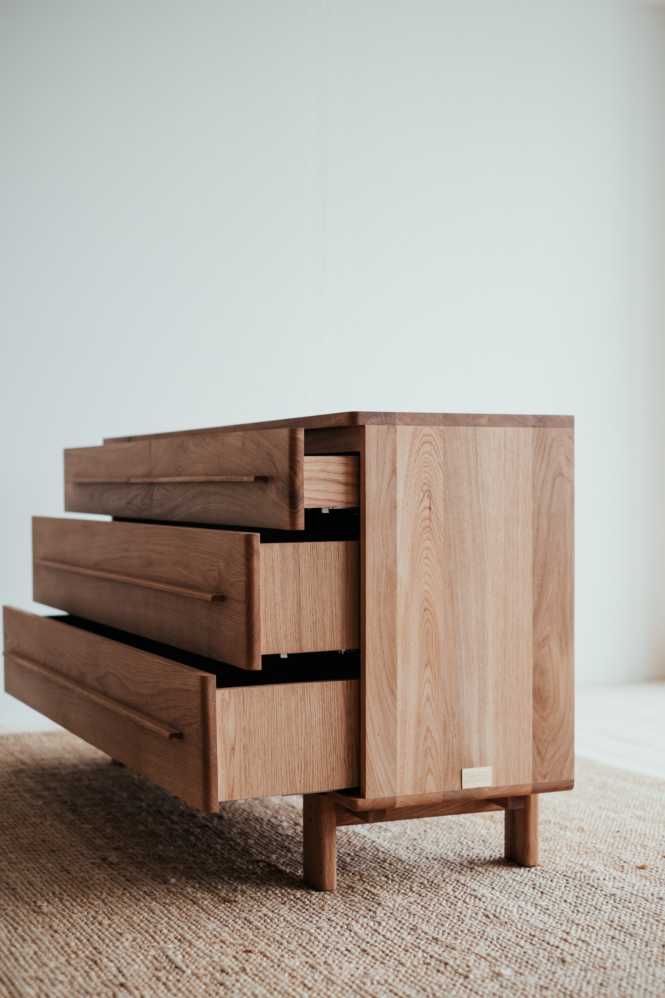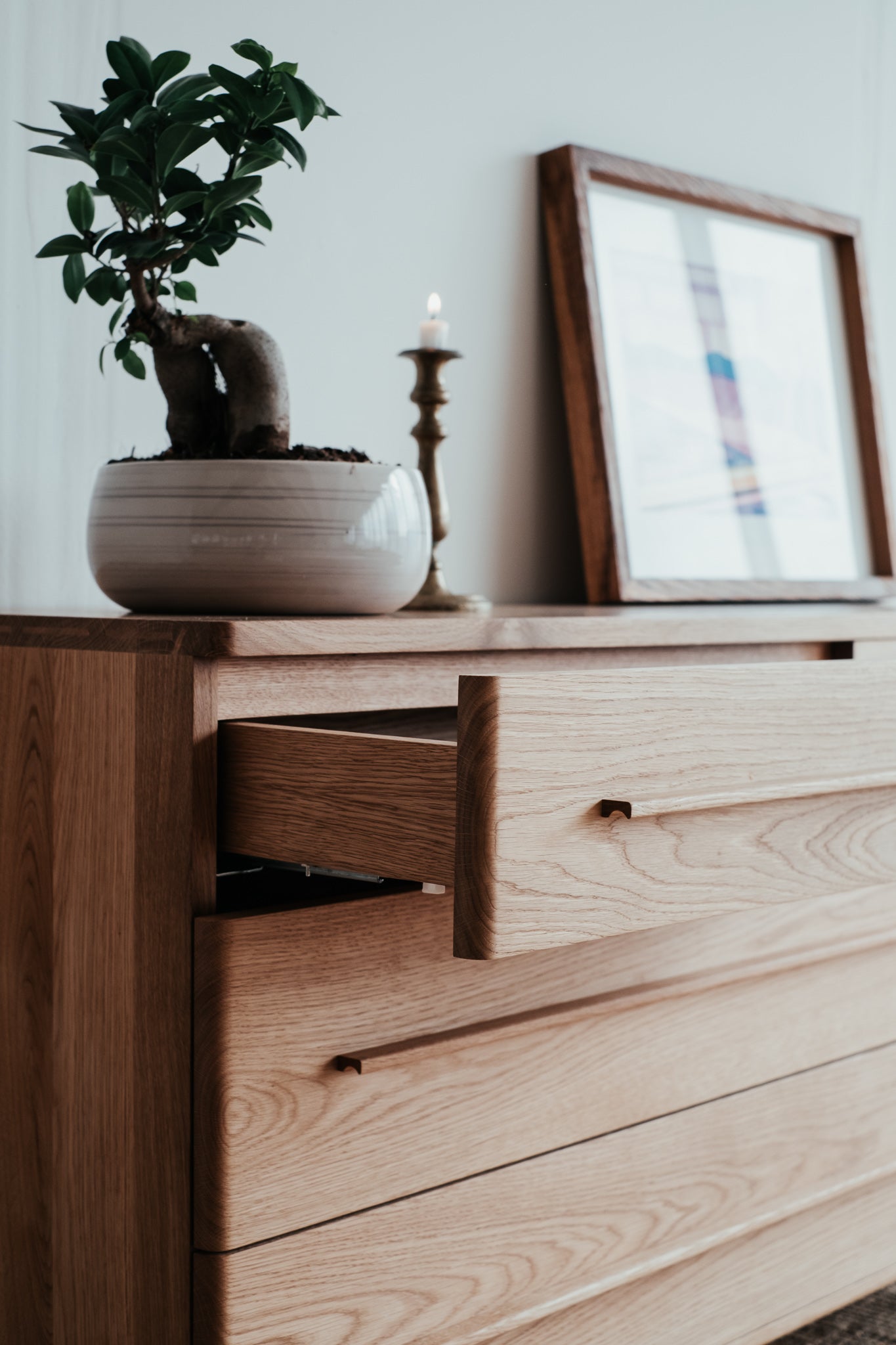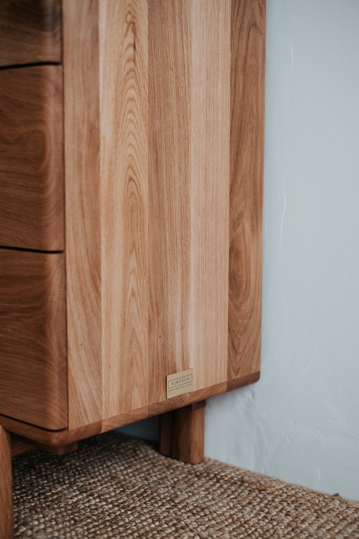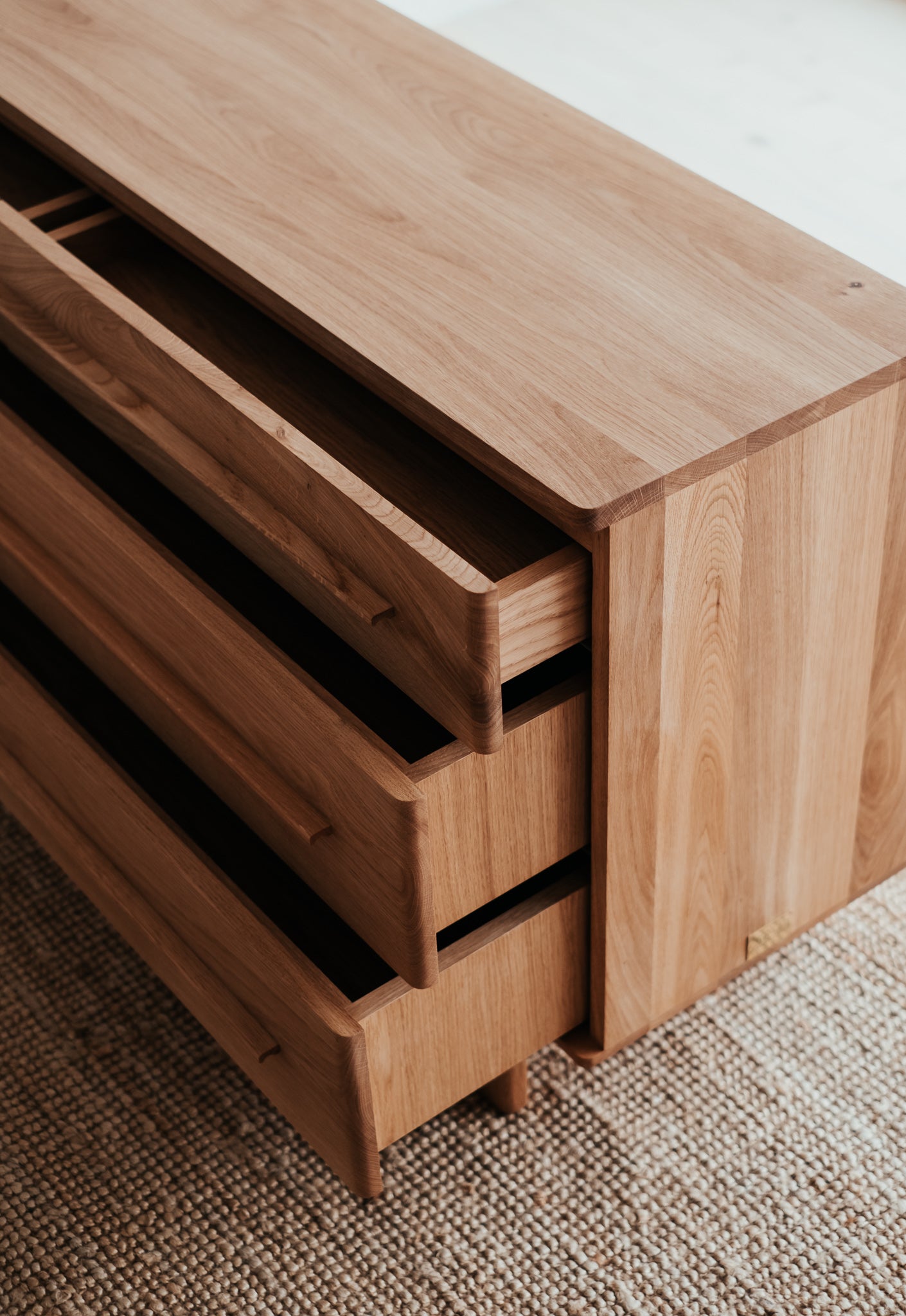 Praktická v každom ohľade a dizajnová z každého uhlu. To je naša masívna komoda z dubového dreva, ktoré sme použili na všetky jej časti. Vďaka tomu získala jedinečný vzhľad a pokojný, harmonický charakter. Štvorica zásuviek s pomalým dojazdom vám zase poskytne dostatok úložného priestoru.