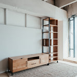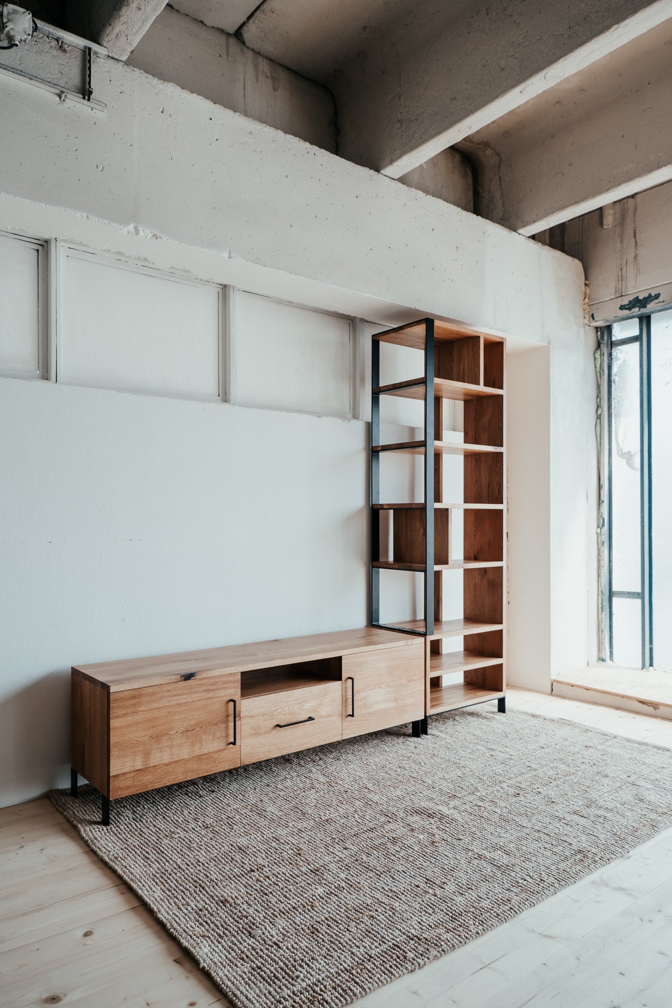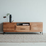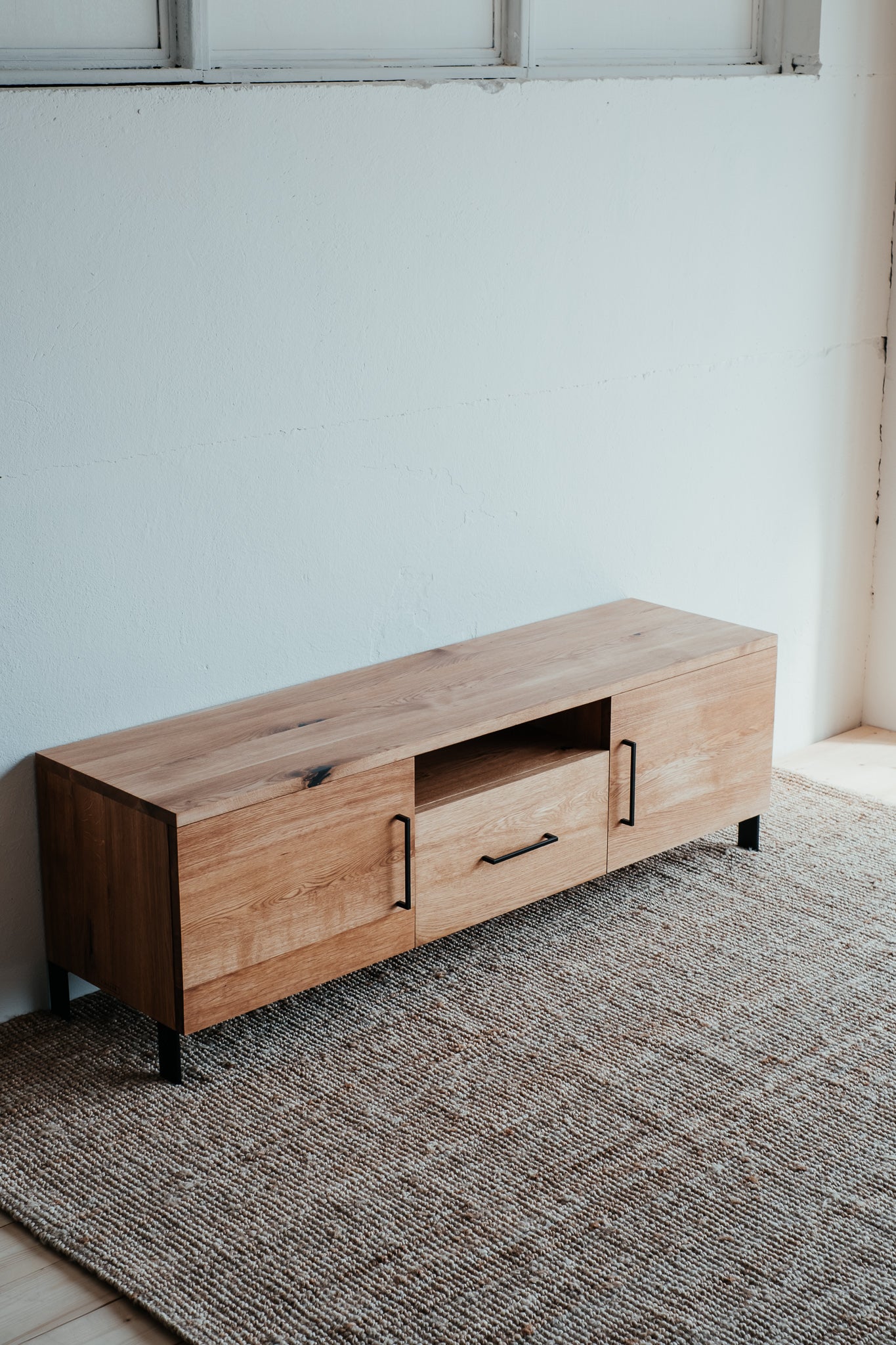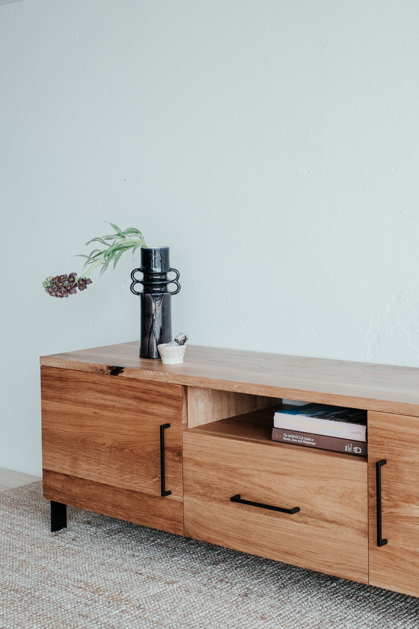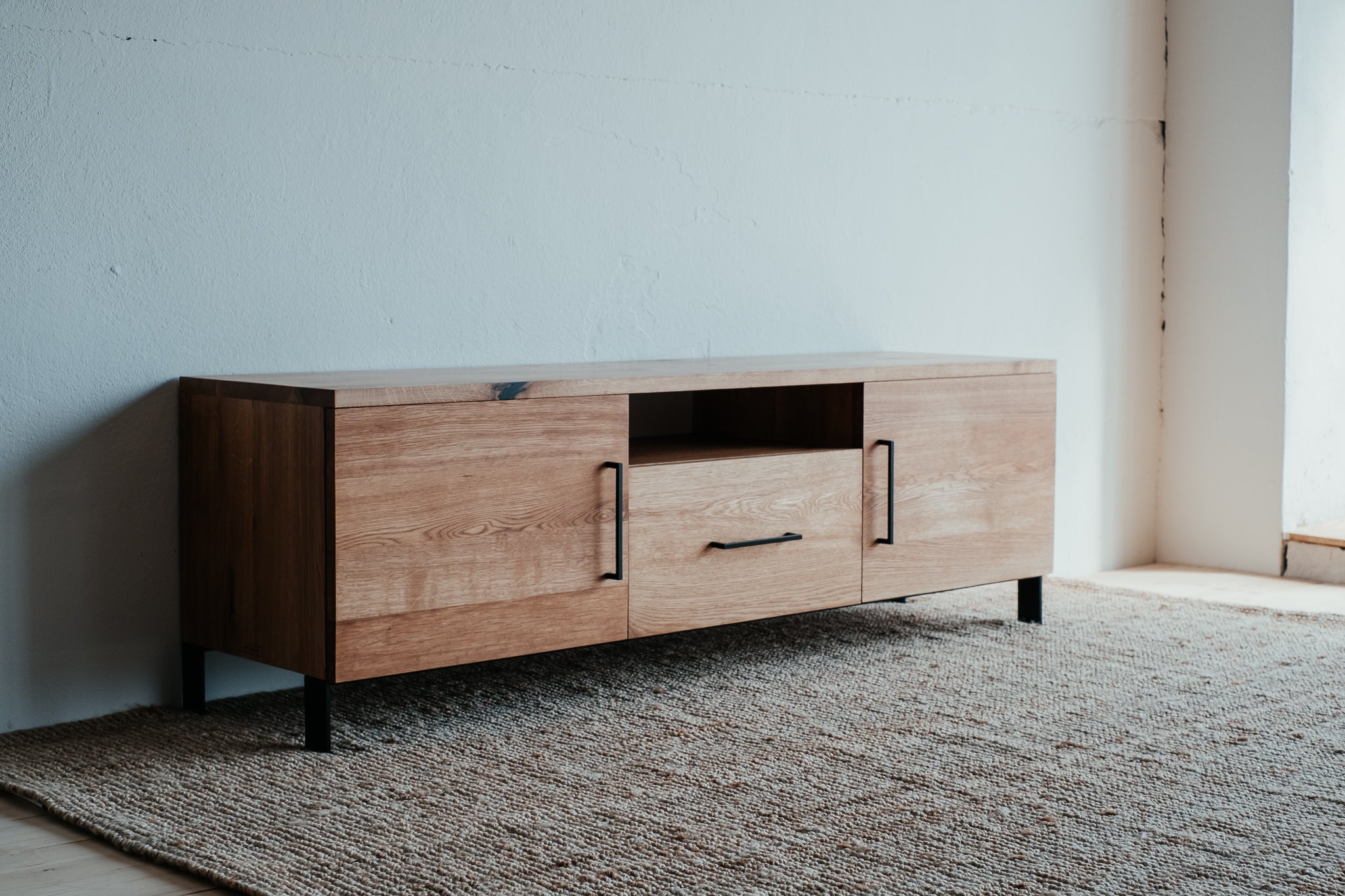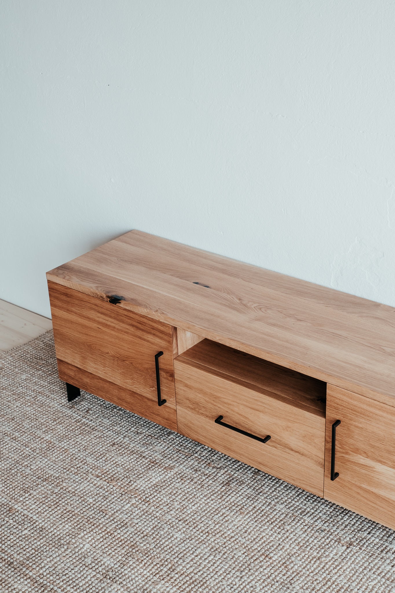 Praktický v každom detaile a každý detail dokonale krásny. Masívny TV stolík z kvalitného dubového dreva prináša veľký odkladací priestor v podobe dvoch skriniek, zásuvky aj otvorenej police. Krásna štruktúra dreva je vkusne doplnená ladnými železnými madlami v čiernej farbe.