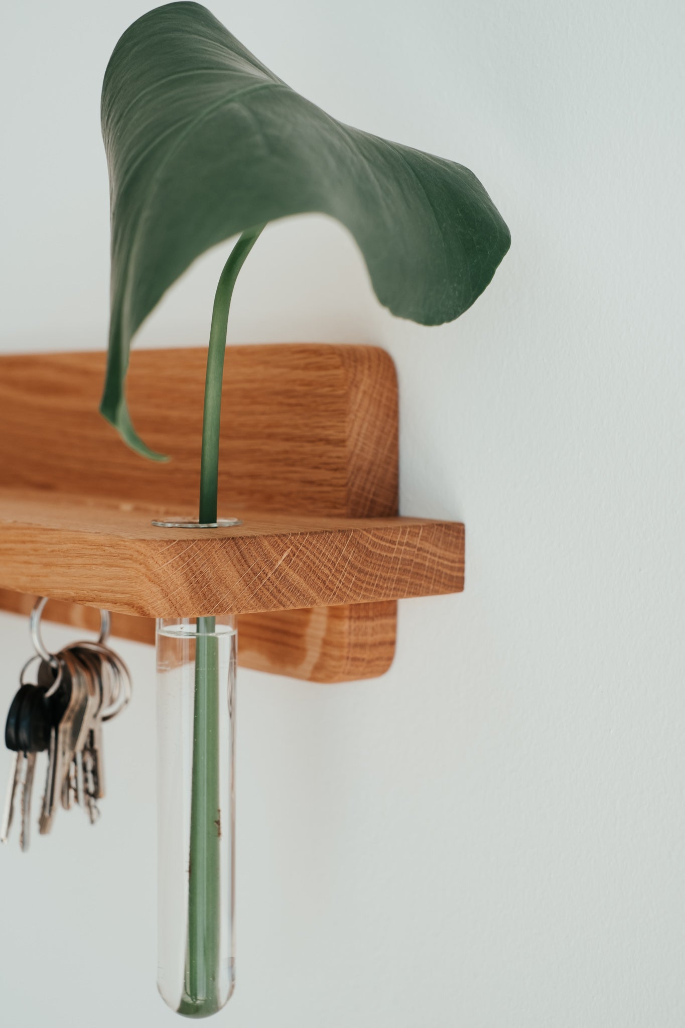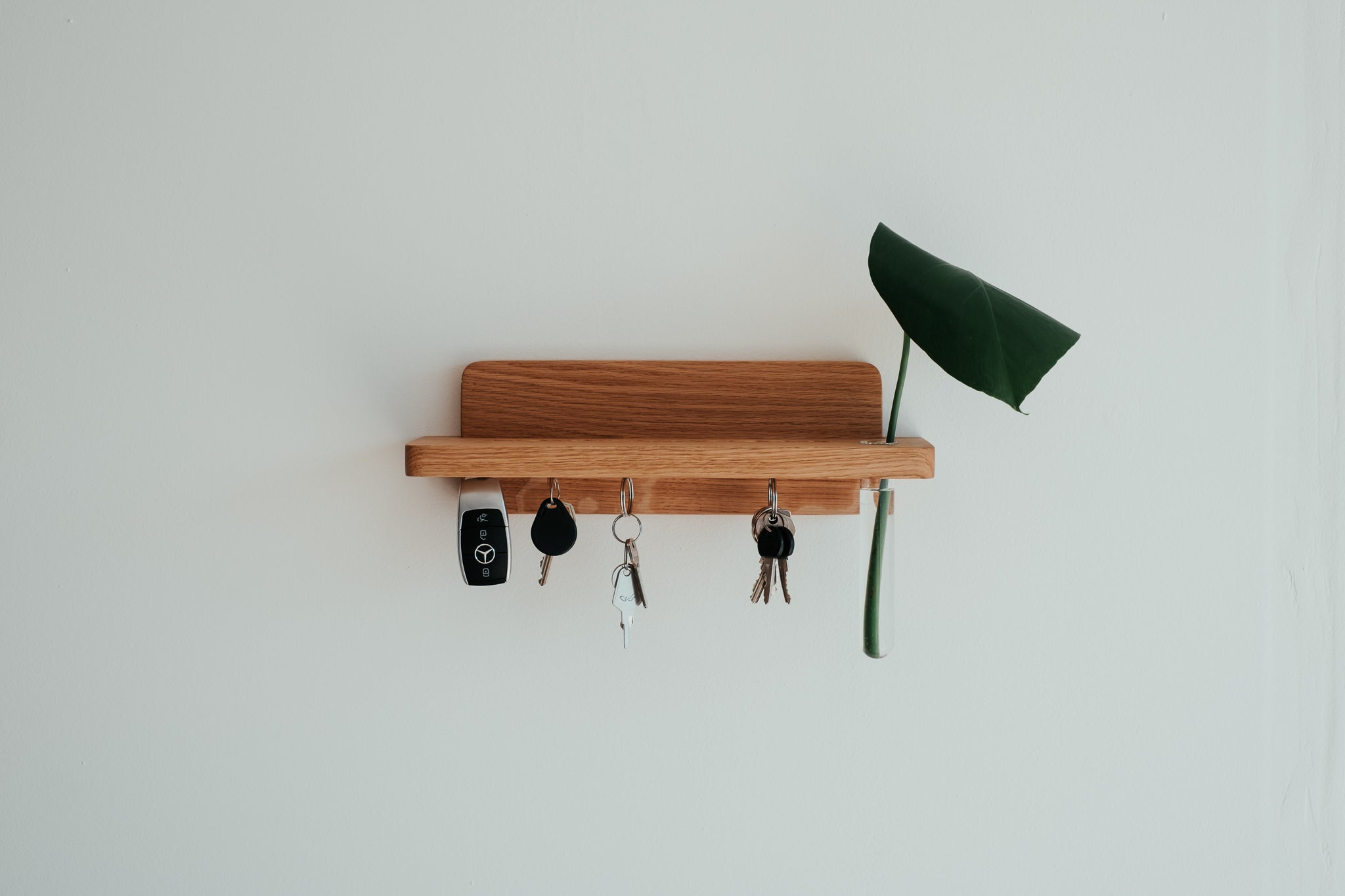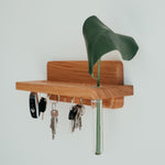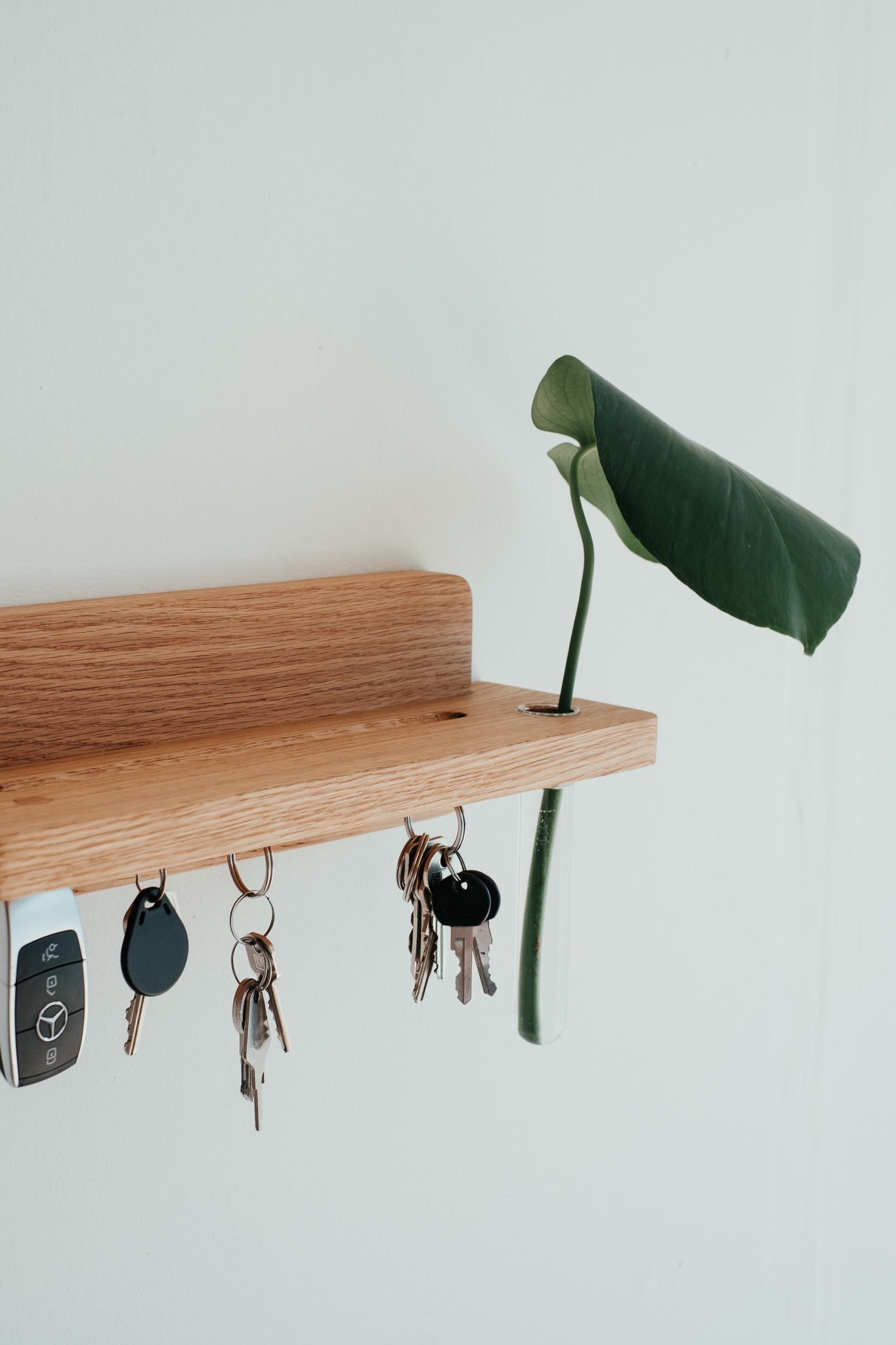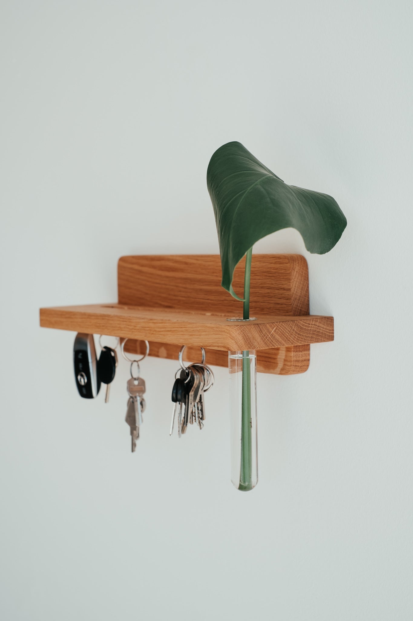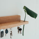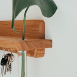 Praktický doplnok s estetickým dizajnom. Vďaka tomuto minimalisticky pôsobiacemu držiaku na kľúče z masívneho dubového dreva už nikdy nezabudnete, kam ste dali kľúče. Vďaka neviditeľnej montáži si zachováva čisté línie a zafrézovaný žliabok je praktickým doplnkom na poštu, slnečné okuliare či iné drobnosti.