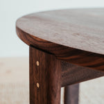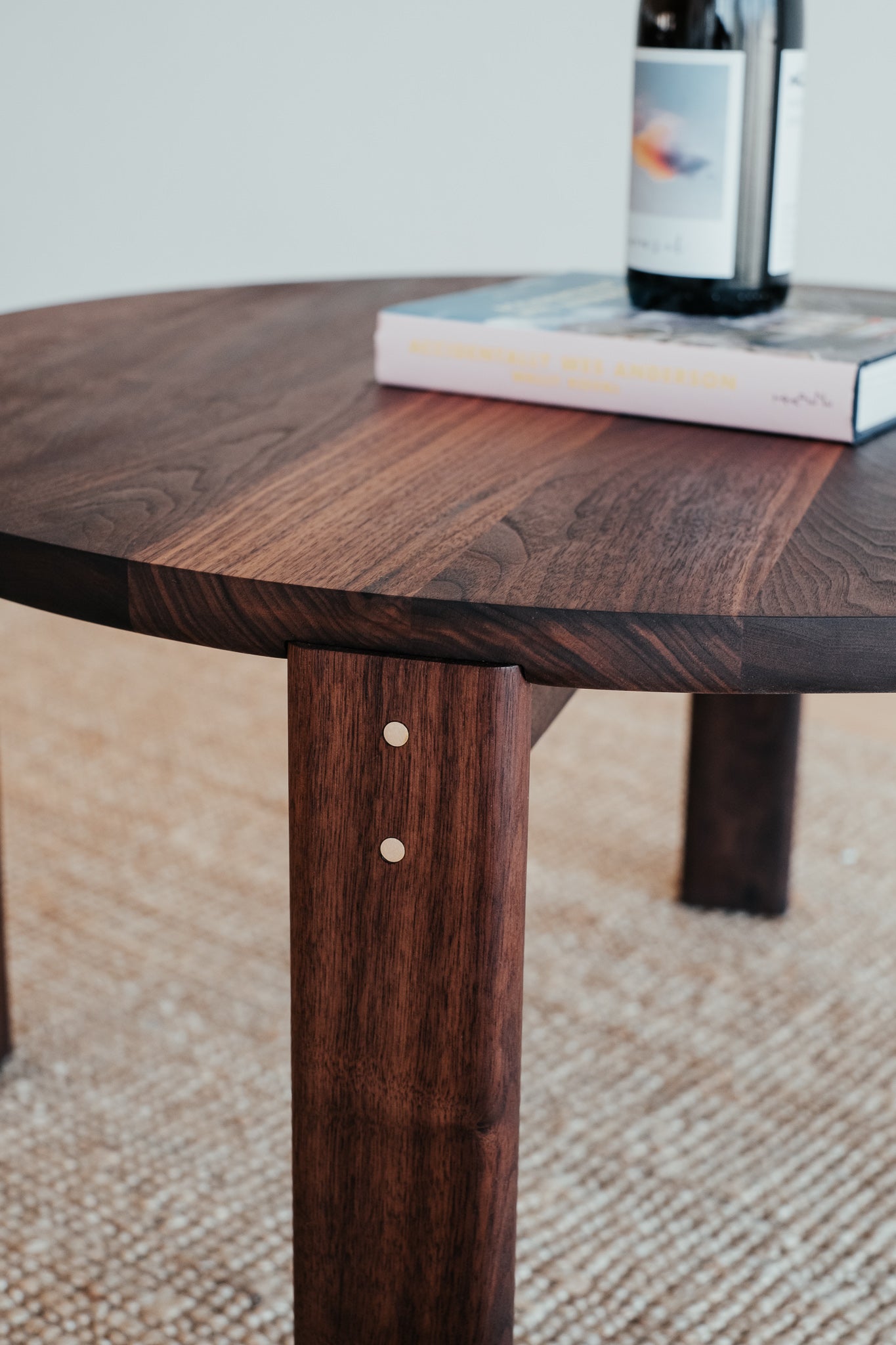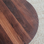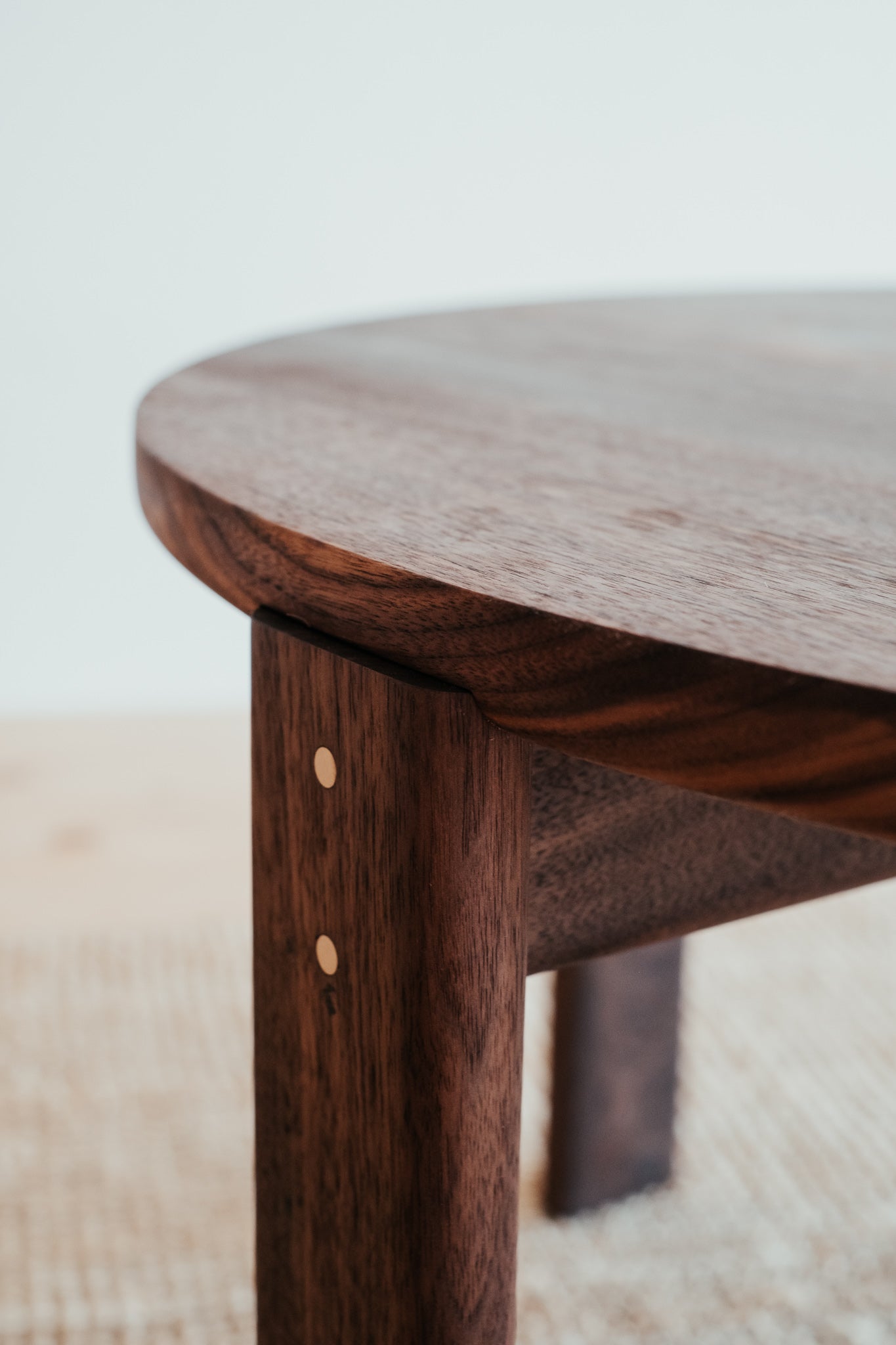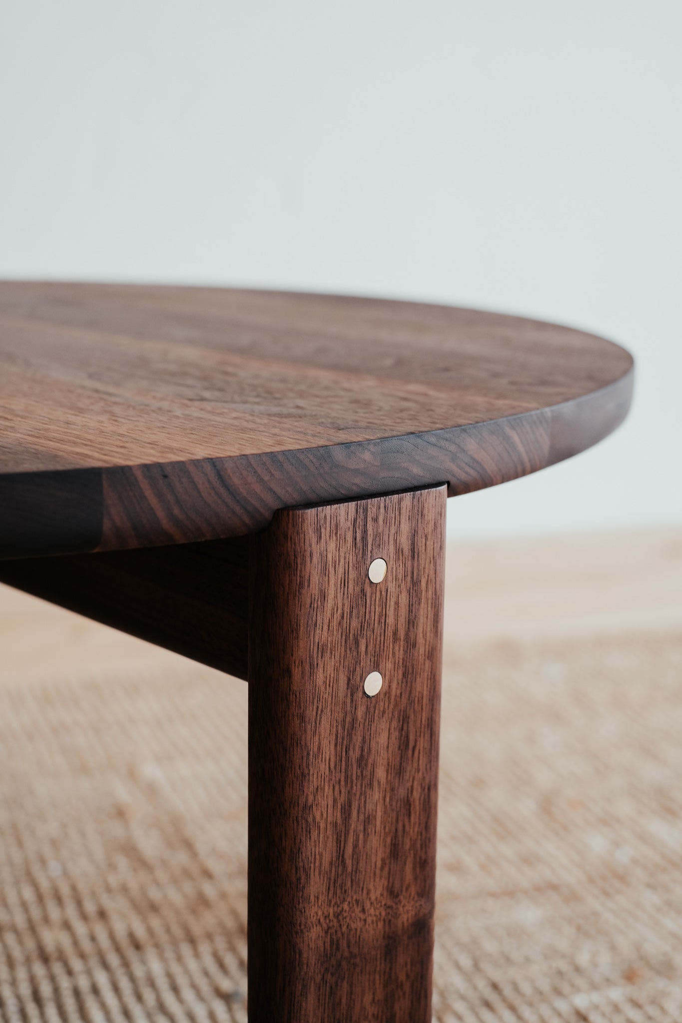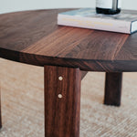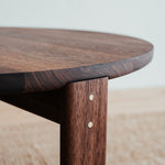 Remeselne dokonalý kruhový stolík, ktorý vyniká krásou dreva, z ktorého pochádza. Jemne zaoblené hrany a čistá plocha s krásnou štruktúrou masívneho orechového dreva s malým, vyšperkovaným detailom v podobe mosadzných kolíkov.