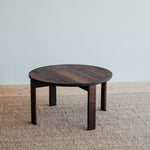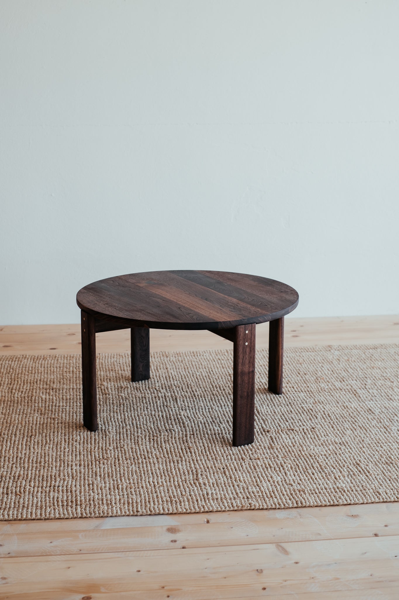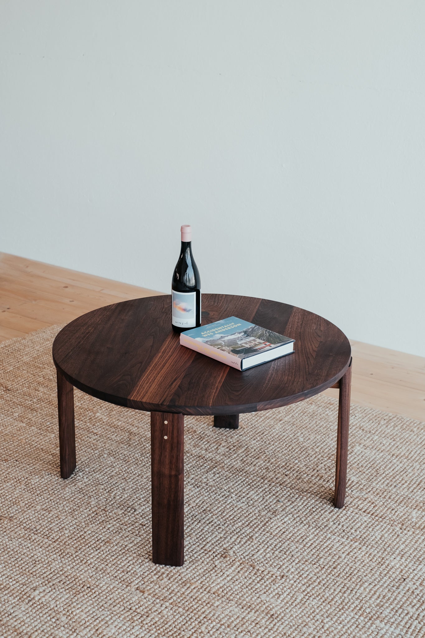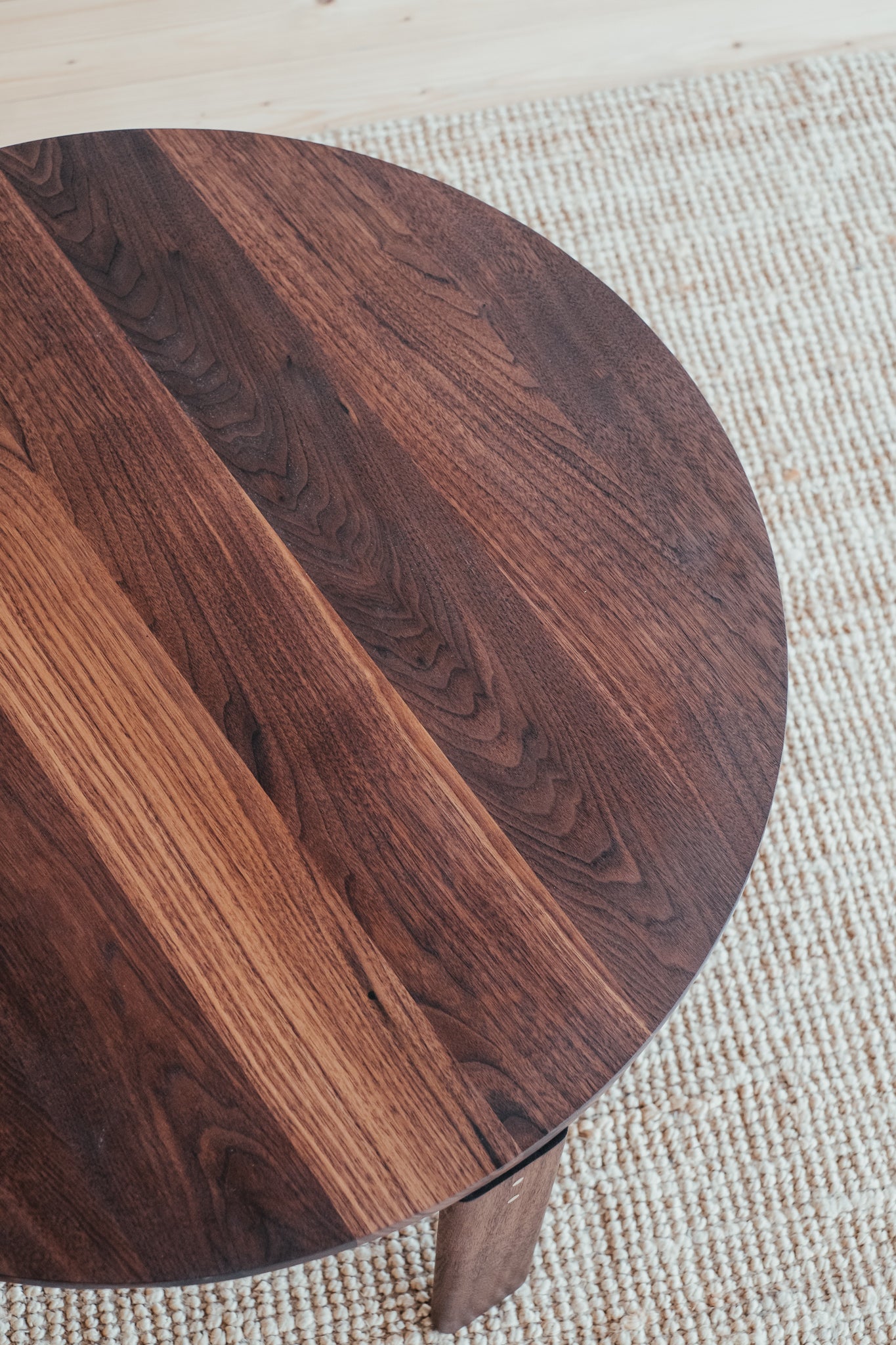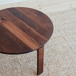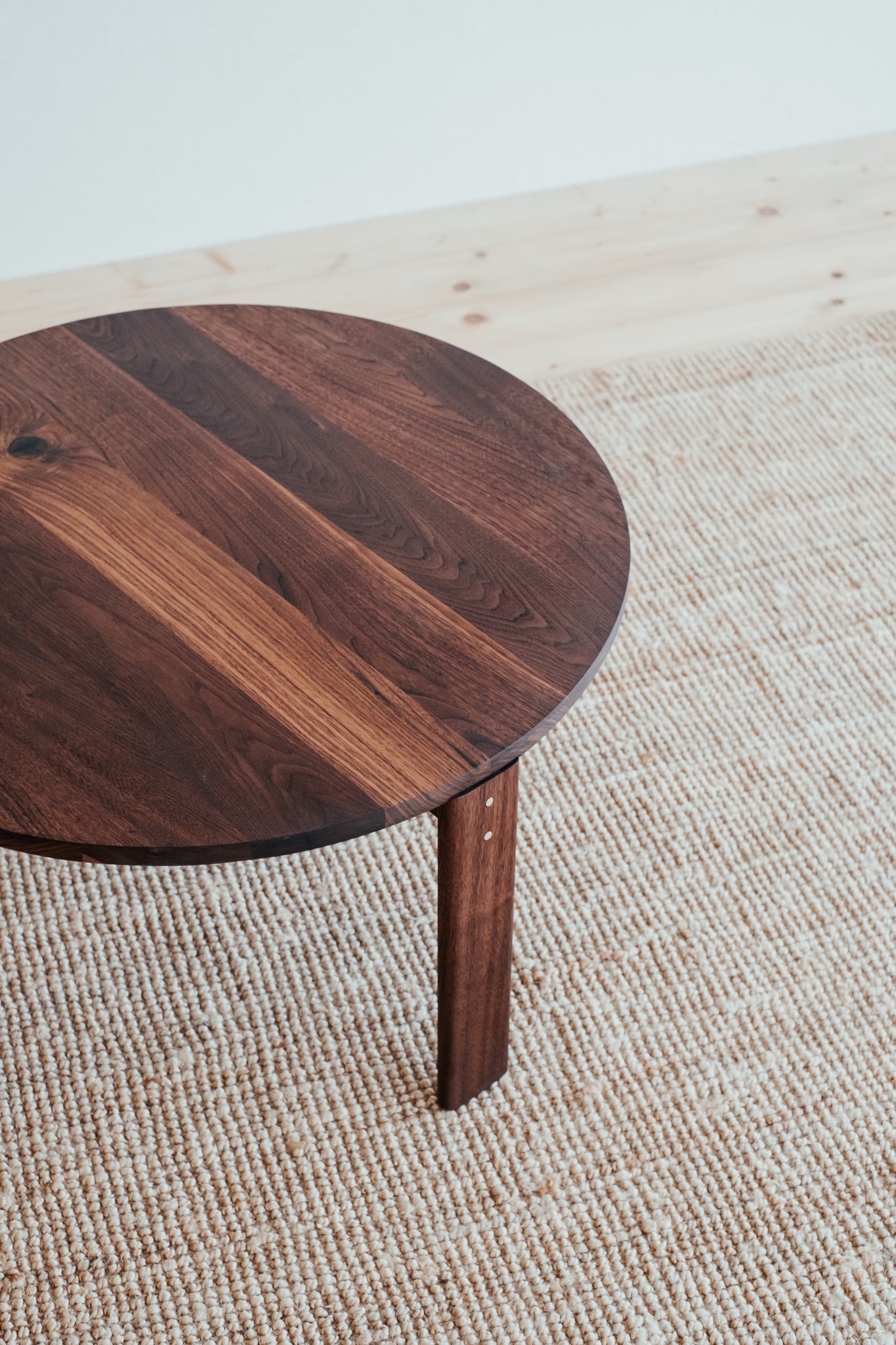 Remeselne dokonalý kruhový stolík, ktorý vyniká krásou dreva, z ktorého pochádza. Jemne zaoblené hrany a čistá plocha s krásnou štruktúrou masívneho orechového dreva s malým, vyšperkovaným detailom v podobe mosadzných kolíkov.