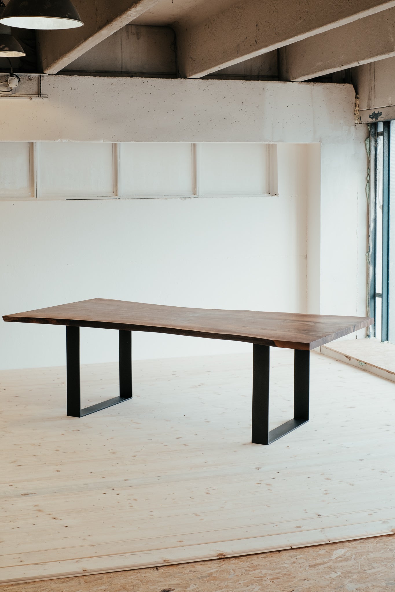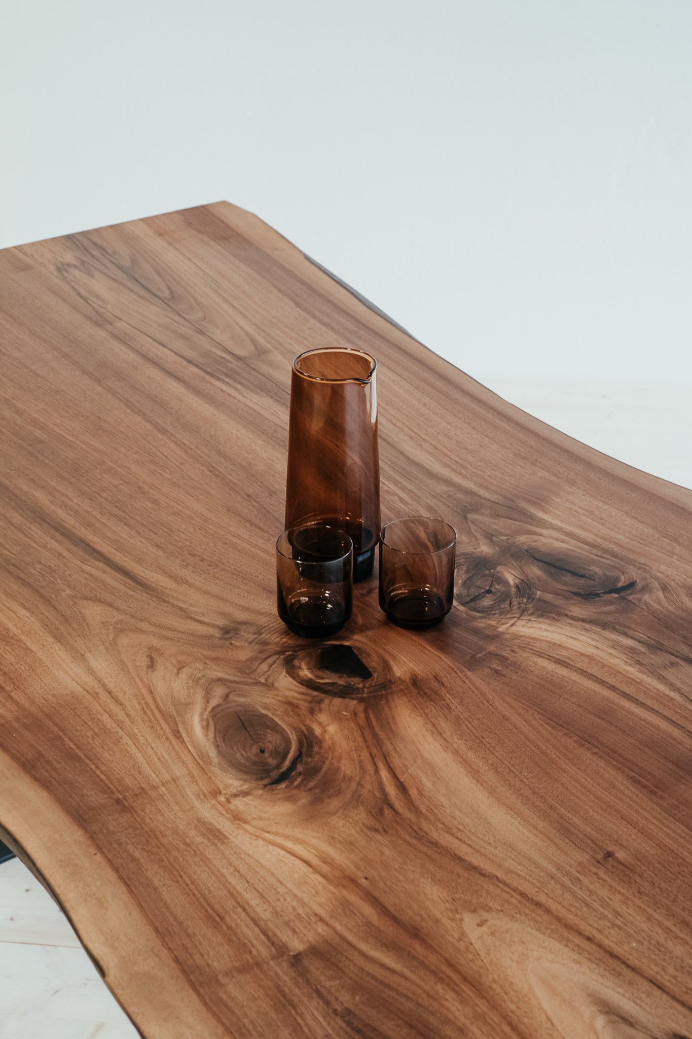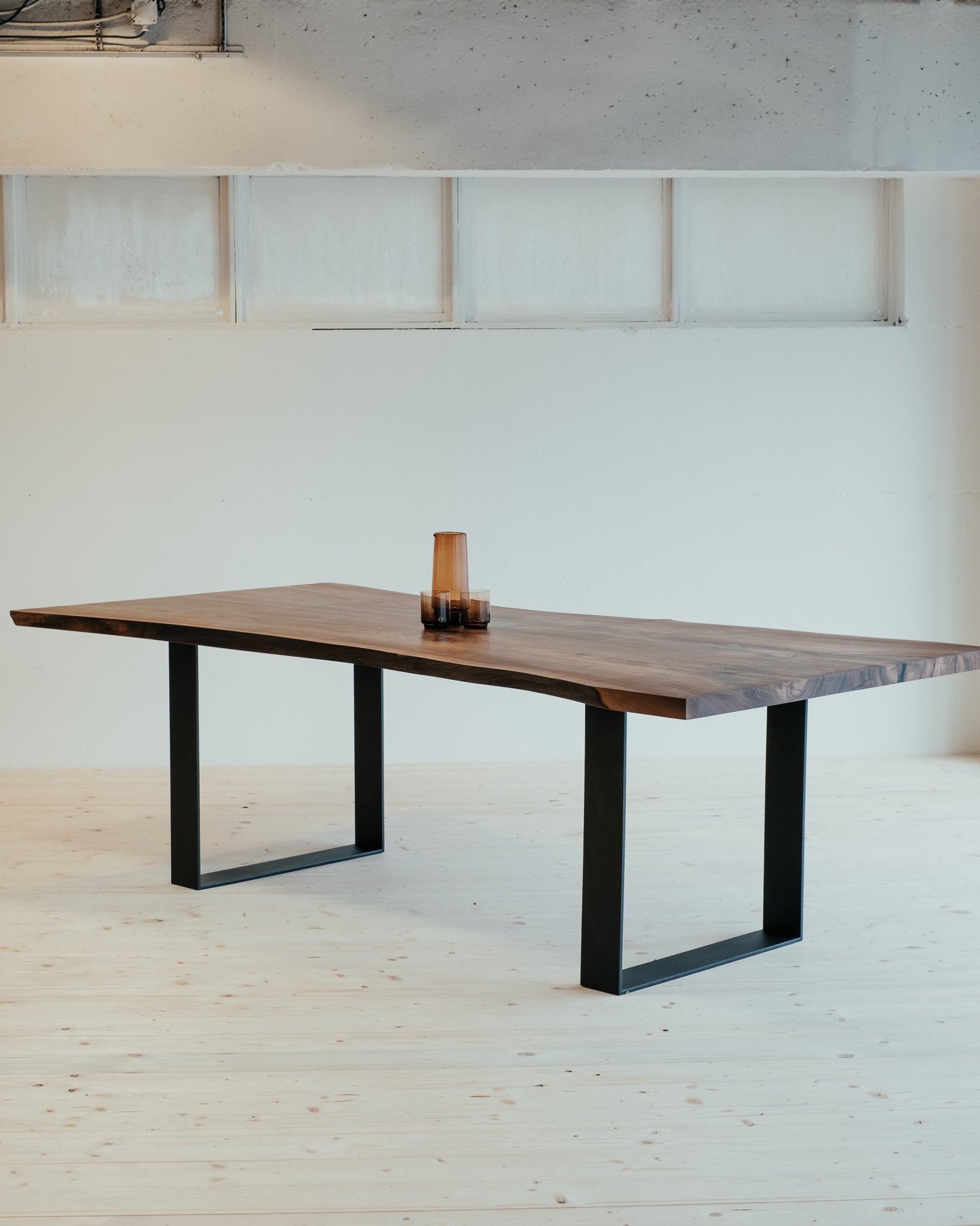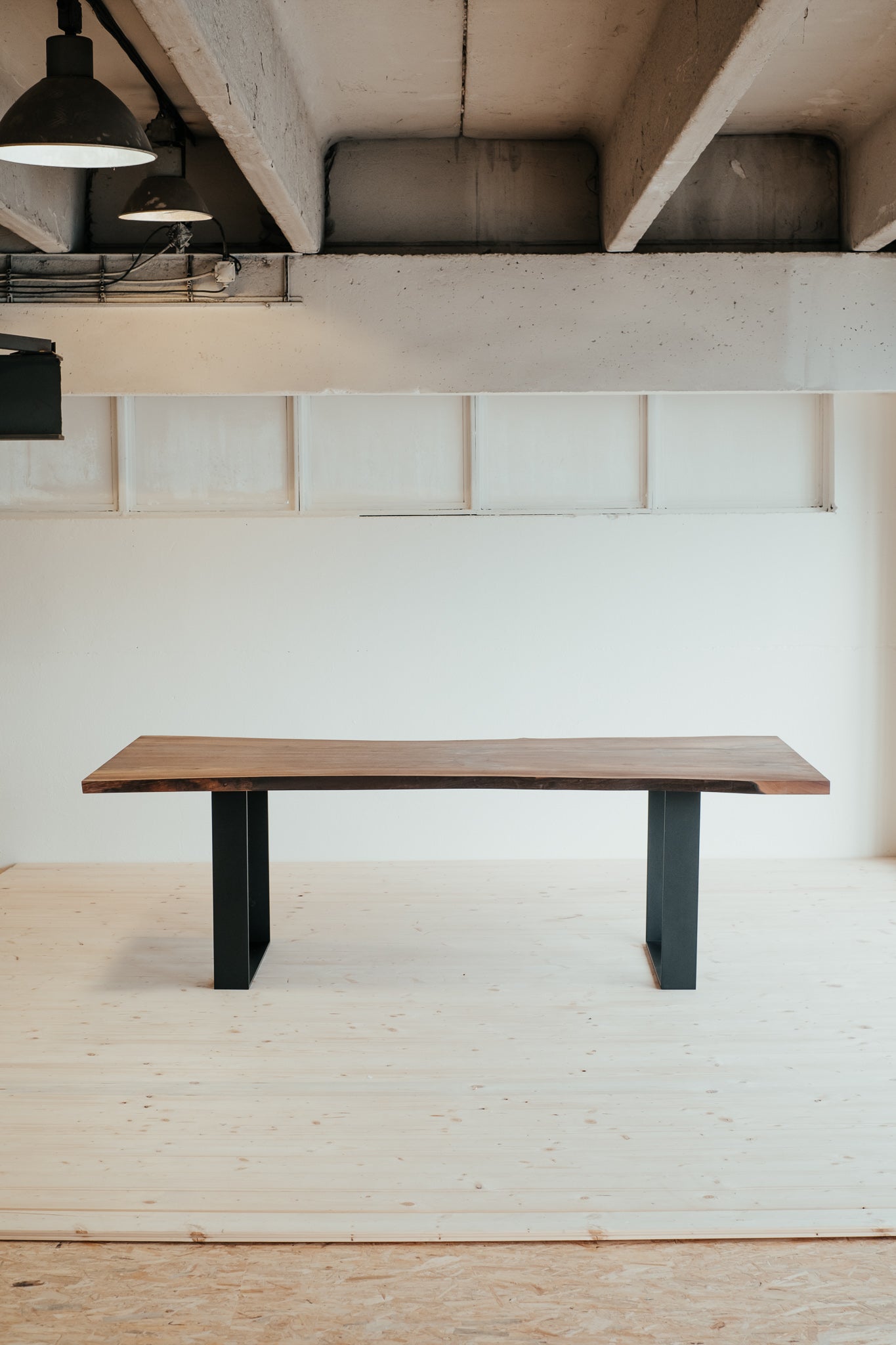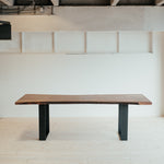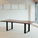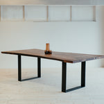 Harmonické spojenie, ktoré vyráža dych. Tento jedinečný monolitický stôl je vyrobený z dvoch dosiek viac ako storočného orechu, ktoré navzájom zrkadlia kmeň stromu. Prierez dokonale vykresľuje krásu tohto vzácneho stromu a dreva. Kovové nohy sú minimalistické a pritom držia líniu masívnosti.